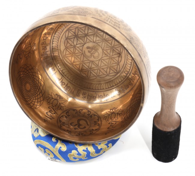 AUTHENTIC HAND HAMMERED (BEATEN) AND SPECIAL HAND CARVING TIBETAN SINGING BOWL SET — This high-quality Flower of Life with Om handcrafted meditation bowl set includes a wooden striker and hand sewn cushion. It is hand hammered in the Himalayan Foothills by Nepalese artisans to be as unique as you are and to create an ambience for emotional calming & healing.
