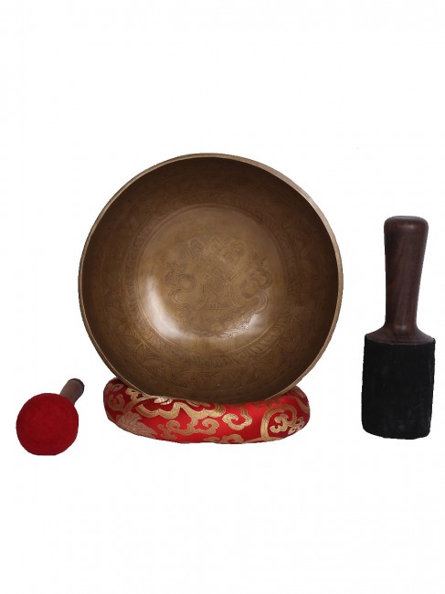 A beautiful inscribed hand crafted singing bowl with Tibetan prayer scripted symbols around the outer wall also it’s embossed with other intricate design on outside and it has abstract Om design on the outside bottom. The inner bottom has an enchanting Tibetan design etched on. It is made from the combination of seven different metals. The singing bowl produces a relaxing and harmonious sound which is used for yoga, music therapy, to clean the atmosphere around us and sound healing. It comes with free wooden Mallet and Silk cushion.