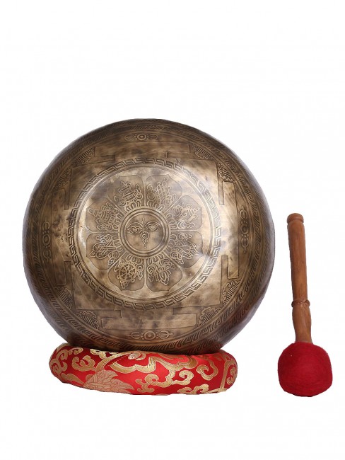 A beautiful inscribed hand crafted singing bowl with Tibetan prayer scripted symbols around the outer wall and it has abstract Sun design on the outside bottom. The inner bottom has intricate God Figure design etched on. It is made from the combination of seven different metals. The singing bowl produces a relaxing and harmonious sound which is used for yoga, music therapy, to clean the atmosphere around us and sound healing. It comes with free wooden Mallet and Silk cushion.