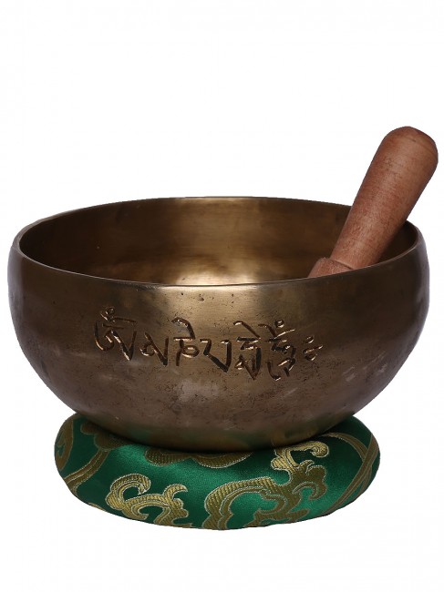 A beautiful inscribed hand crafted singing bowl with an embossed Tibetan inscription (mantra) design on outside and inside it has an embossed Sankha design. It is made from the combination of seven different metals. The singing bowl produces a relaxing and harmonious sound which is used for yoga, music therapy, to clean the atmosphere around us, religious ceremonies and sound healing. It comes with free wooden Mallet and Silk cushion.