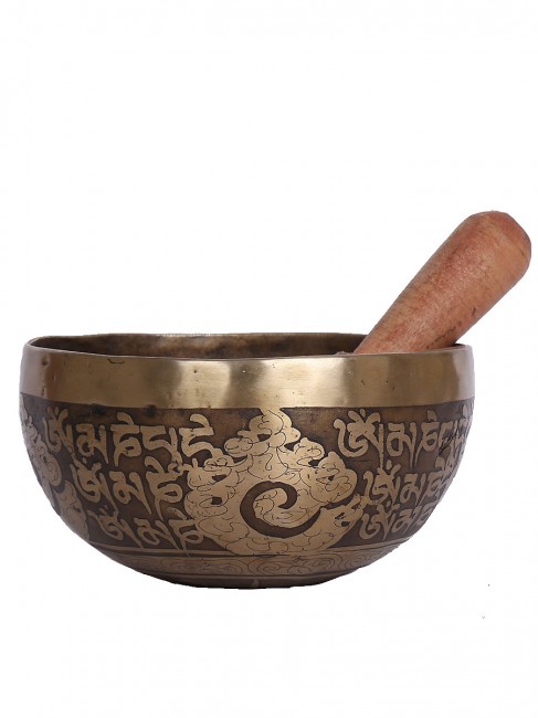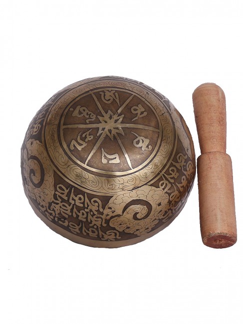 A beautiful inscribed hand crafted singing bowl with Tibetan prayer scripted symbols around the outer wall also it’s embossed with other intricate design on outside and it has abstract Tibetan letter design on the outside bottom. The inner bottom has intricate Buddha eyes design etched on. It is made from the combination of seven different metals. The singing bowl produces a relaxing and harmonious sound which is used for yoga, music therapy, to clean the atmosphere around us and sound healing. It comes with free wooden Mallet and Silk cushion.