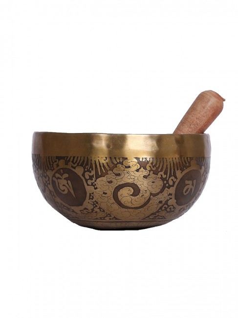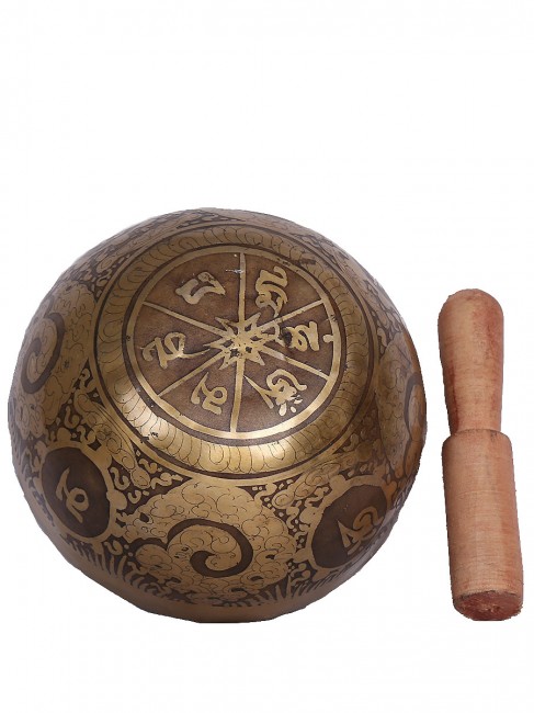 A beautiful inscribed hand crafted singing bowl with big symbolic Tibetan letter around the outer wall also it’s embossed with other intricate design on outside and it has abstract Tibetan letter design on the outside bottom. The inner bottom has intricate Buddha eyes design etched on. It is made from the combination of seven different metals. The singing bowl produces a relaxing and harmonious sound which is used for yoga, music therapy, to clean the atmosphere around us and sound healing. It comes with free wooden Mallet and Silk cushion.
