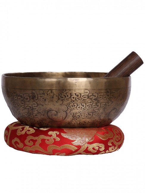 A beautiful inscribed hand crafted singing bowl with Tibetan inscription (Mantra) around the outer wall also it’s embossed with other intricate design on outside and it has abstract Buddha eyes design on the outside bottom. The inner bottom has intricate Ashtamangala design etched on. It is made from the combination of seven different metals. The singing bowl produces a relaxing and harmonious sound which is used for yoga, music therapy, to clean the atmosphere around us and sound healing. It comes with free wooden Mallet and Silk cushion.