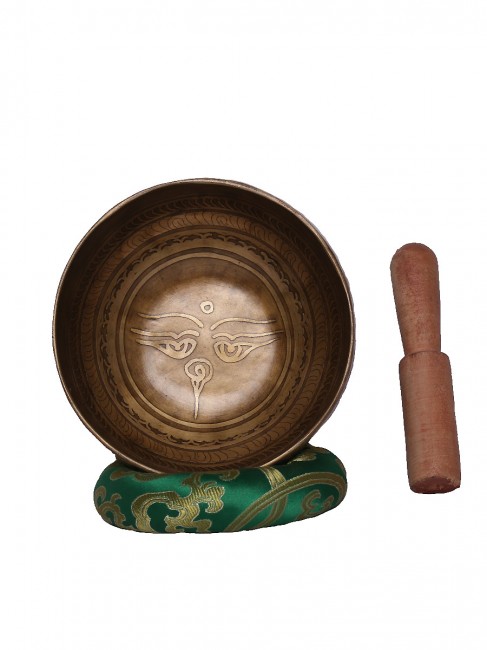A beautiful inscribed hand crafted singing bowl with big symbolic Tibetan letter around the outer wall also it’s embossed with other intricate design on outside and it has abstract Tibetan letter design on the outside bottom. The inner bottom has intricate Buddha Eye design etched on. It is made from the combination of seven different metals. The singing bowl produces a relaxing and harmonious sound which is used for yoga, music therapy, to clean the atmosphere around us and sound healing. It comes with free wooden Mallet and Silk cushion.