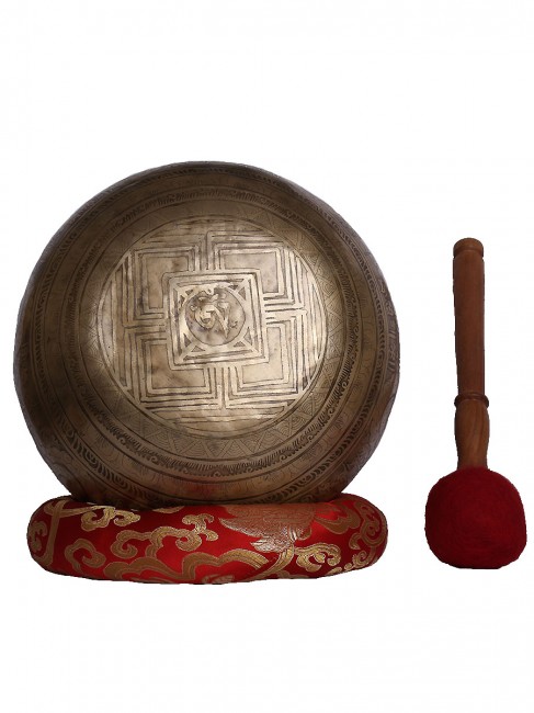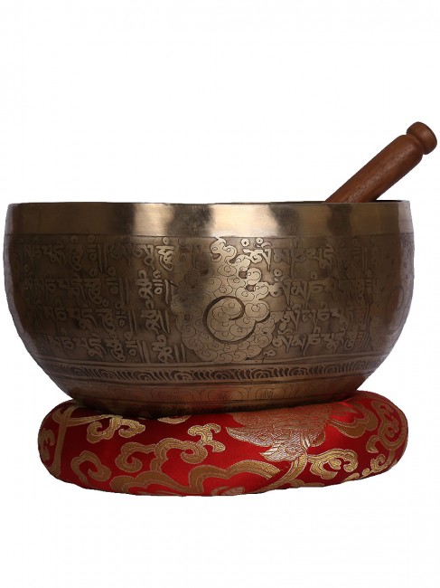 A beautiful inscribed hand crafted singing bowl with big symbolic Tibetan letter around the outer wall also it’s embossed with other intricate design on outside and it has abstract Ashtamangala with Om design on the outside bottom. The inner bottom has intricate Lotus with Tibetan letter etched on. It is made from the combination of seven different metals. The singing bowl produces a relaxing and harmonious sound which is used for yoga, music therapy, to clean the atmosphere around us and sound healing. It comes with free wooden Mallet and Silk cushion.