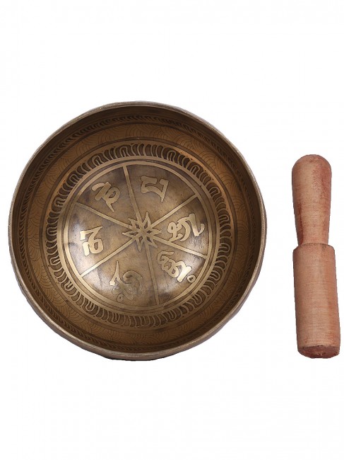A beautiful inscribed hand crafted singing bowl with big symbolic Tibetan letter around the outer wall also it’s embossed with other intricate design on outside and it has abstract Om design on the outside bottom. The inner bottom has intricate Tibetan letter design etched on. It is made from the combination of seven different metals. The singing bowl produces a relaxing and harmonious sound which is used for yoga, music therapy, to clean the atmosphere around us and sound healing. It comes with free wooden Mallet and Silk cushion.