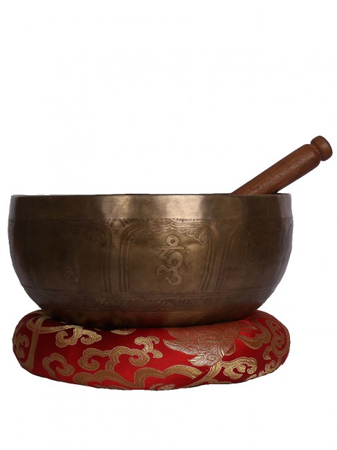 A beautiful inscribed hand crafted singing bowl with big symbolic Tibetan letter around the outer wall also it’s embossed with other intricate design on outside and it has abstract Ashtamangala (Buddhist revered symbols) design on the outside bottom. The inner bottom has intricate Sankha design etched on. It is made from the combination of seven different metals. The singing bowl produces a relaxing and harmonious sound which is used for yoga, music therapy, to clean the atmosphere around us and sound healing. It comes with free Felt wrapped wooden Mallet and Silk cushion.