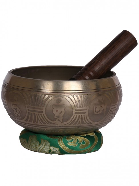 A beautiful authentic machine made singing bowl inscribed with big symbolic spiritual Tibetan letters on the outer wall with other intricate design and it has an enchanting spiritual Tibetan letter design on the outside bottom. The inner bottom has an embossed Tibetan letter Om design etched on. It is made from the combination of seven different metals such as iron, mercury, copper, tin, lead, gold and silver. The singing bowl creates a relaxing and harmonious sound which is used for yoga, music therapy, to clean the atmosphere around us and sound healing. It comes with free wooden Mallet and Silk cushion.