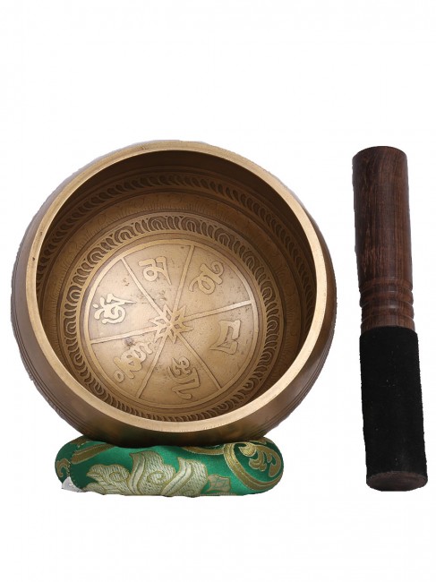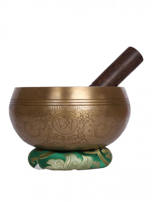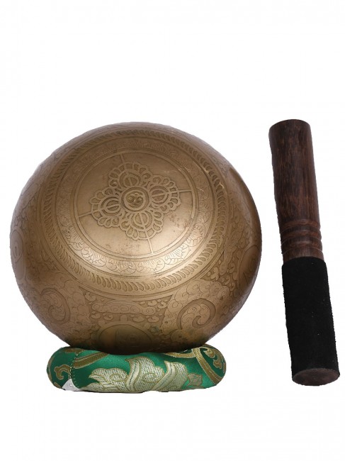 A beautiful authentic machine made singing bowl inscribed with big symbolic spiritual Tibetan letters on the outer wall with other intricate design and it has an embossed Bajra design on the outside bottom. The inner bottom has enchanting spiritual Tibetan letter design etched on. It is made from the combination of seven different metals such as iron, mercury, copper, tin, lead, gold and silver. The singing bowl creates a relaxing and harmonious sound which is used for yoga, music therapy, to clean the atmosphere around us and sound healing. It comes with free wooden Mallet and Silk cushion.