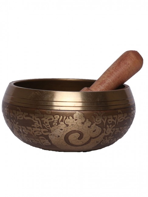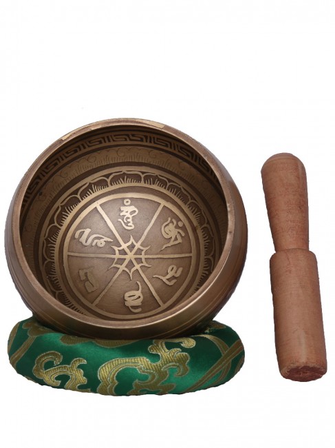 A beautiful authentic machine made singing bowl inscribed with spiritual Tibetan prayers script on the outer wall with other intricate design and it has an embossed Buddhist revered symbol design on outside of the bottom. In the inner bottom it has an enchanting Tibetan spiritual letter design etched on. It is made from the combination of seven different metals such as iron, mercury, copper, tin, lead, gold and silver. It gives out a melodious tone when played. The singing bowl creates a relaxing and harmonious sound which is used for yoga, music therapy, to clean the atmosphere around us and sound healing. It comes with free wooden Mallet and Silk cushion.
