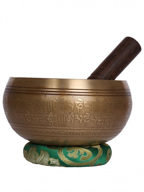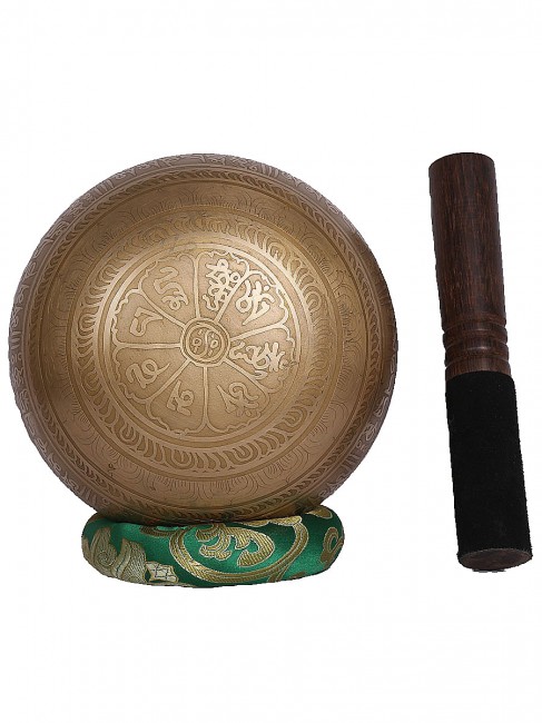 A beautiful authentic machine made singing bowl inscribed with spiritual Tibetan prayers script on the outer wall and it has an enchanting spiritual Tibetan letter design on the outside bottom. In the inner bottom it has a abstract Bajra design etched on. It is made from the combination of seven different metals such as iron, mercury, copper, tin, lead, gold and silver. It gives out a melodious tone when played. The singing bowl creates a relaxing and harmonious sound which is used for yoga, music therapy, to clean the atmosphere around us and sound healing. It comes with free wooden Mallet and Silk cushion.