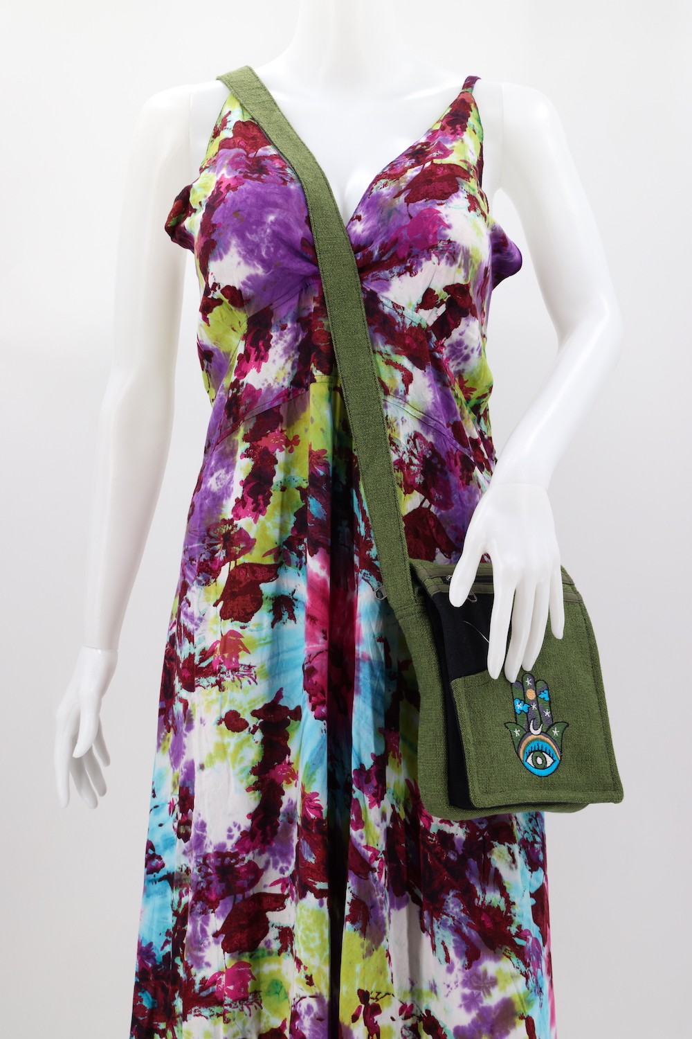 The beautiful Hand-Woven Cotton Travel bag is hand made in Nepal with pure 100% organic Himalaya Cotton. This modern Mushroom Embroidery Cotton passport bag is supremely versatile and fashionable. This bag features are it has two compartments with zippers and it has adjustable strap with outside two pockets in the front and in the main pocket above with a zipper. It is a fair trade made product.