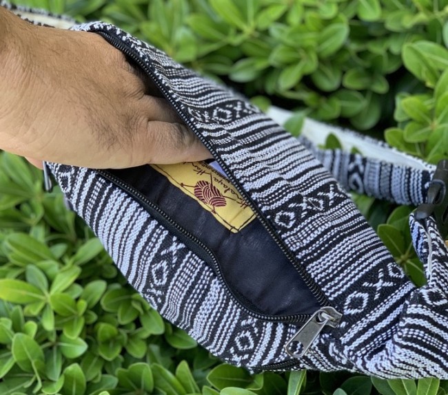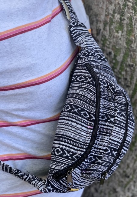 100% pure Hand woven Gheri Cotton Multi Black Color money belt (Fanny Pack) handmade in Nepal. This product can be use by both men and women west or can be worn lower on the hips. This bag has charming features, it is practical and versatile because it can be belt bag/fanny pack /shoulder bag, it has 3 pockets with zippers, the belt is adjustable 32 - 45 inch which can make shorter and longer as well. It is fair trade product. Size: 29 x14x10 cm (12.5x5.5x4 inches)