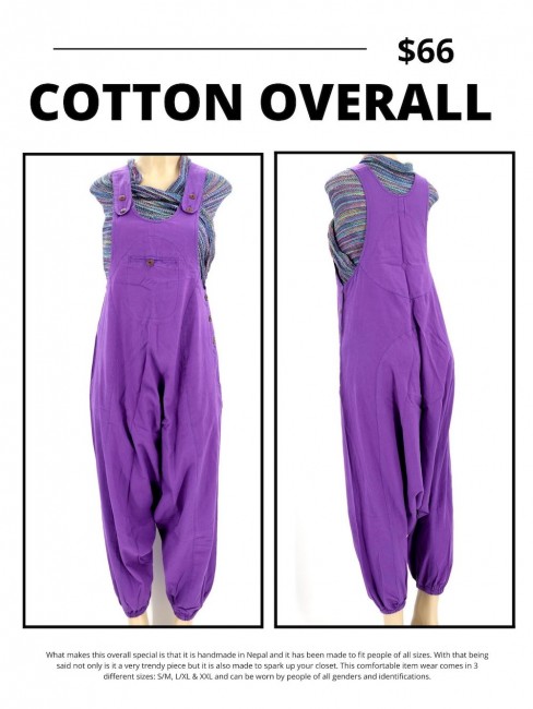 What makes this overall special is that it is handmade in Nepal and it has been made to fit people of all sizes. With that being said not only is it a very trendy piece but it is also made to spark up your closet. This comfortable item wear comes in 3 different sizes: S/M, L/XL & XXL and can be worn by people of all genders and identifications.