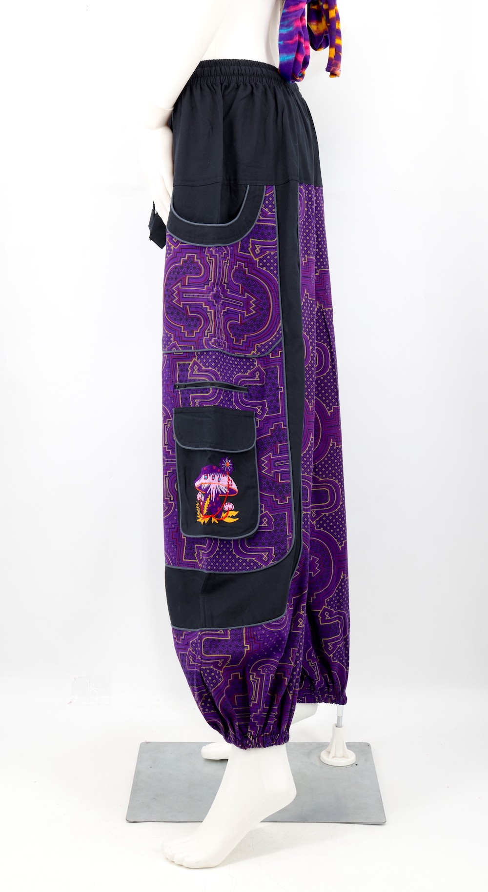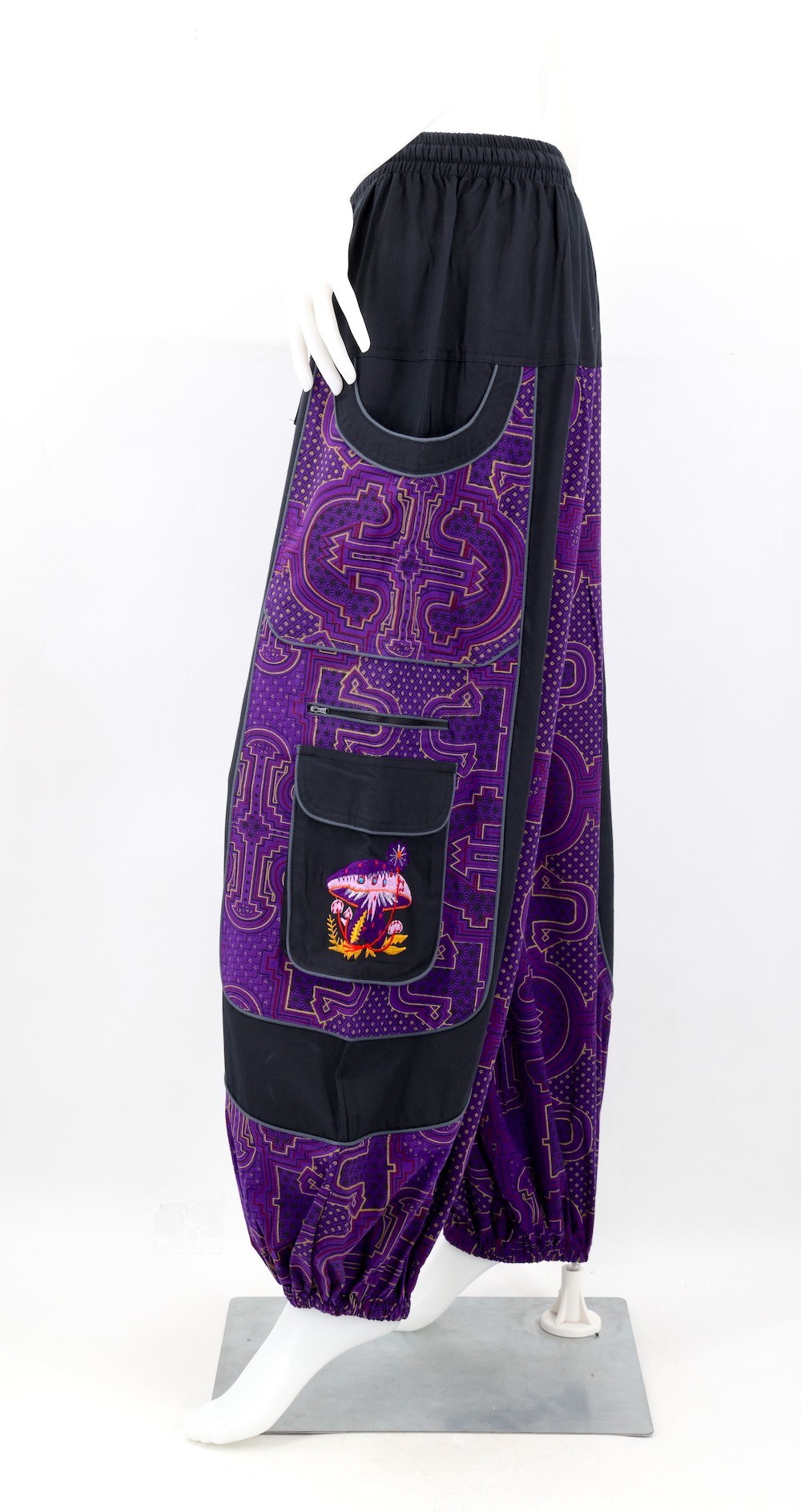 - Traditional harem pant silhouette