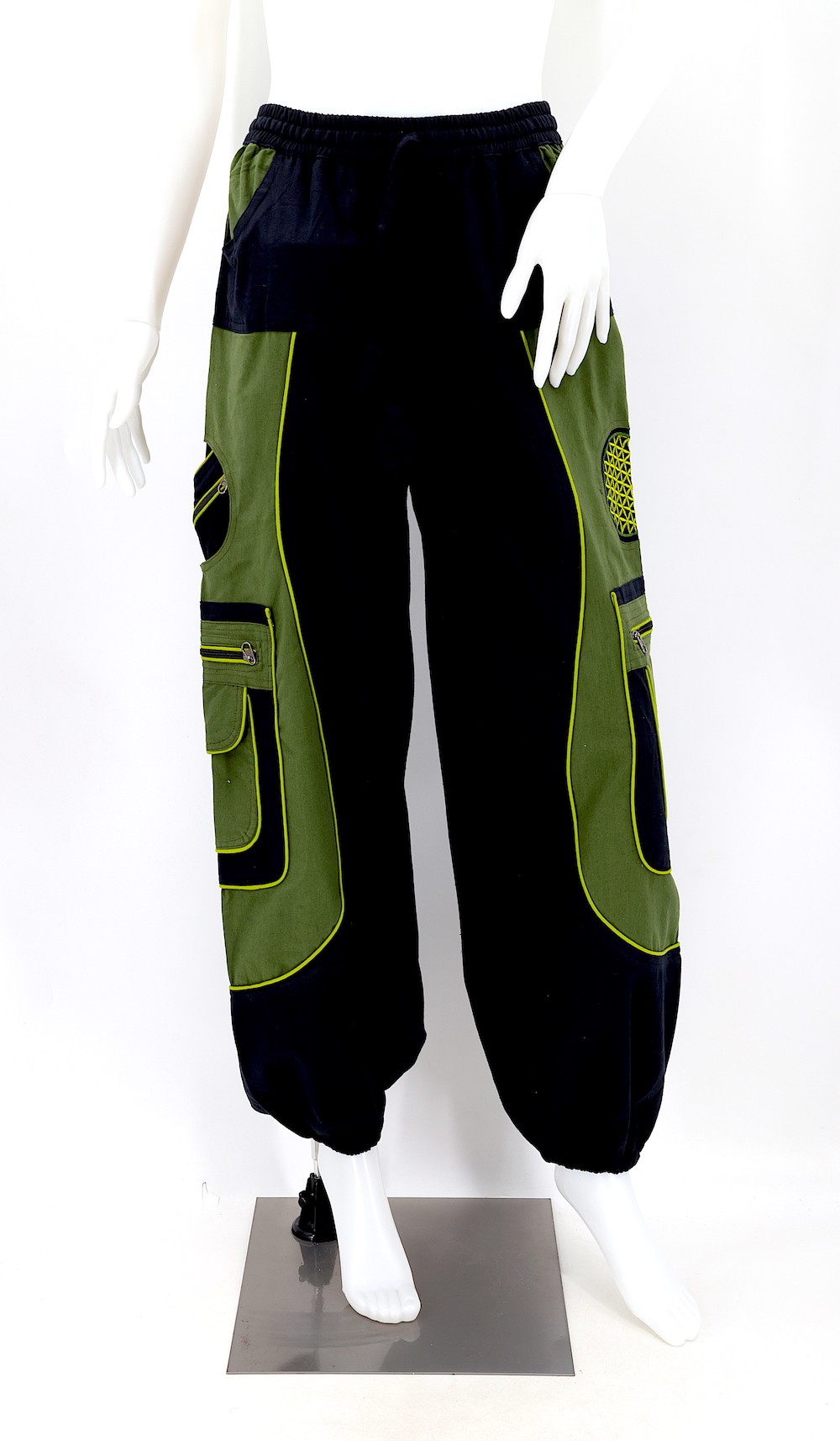 These pants come with an adjustable waist that can be easily tailored to your needs, depending on the size you are wearing. Each side boasts three pockets, featuring a larger pocket with a secure zipper to keep your items and valuables safe, as well as a smaller buttoned pocket for added convenience, in addition to smaller pockets in the hips. There is also a zippered pocket on the left hand side. Additionally, the elasticated ankles provide a comfortable fit.