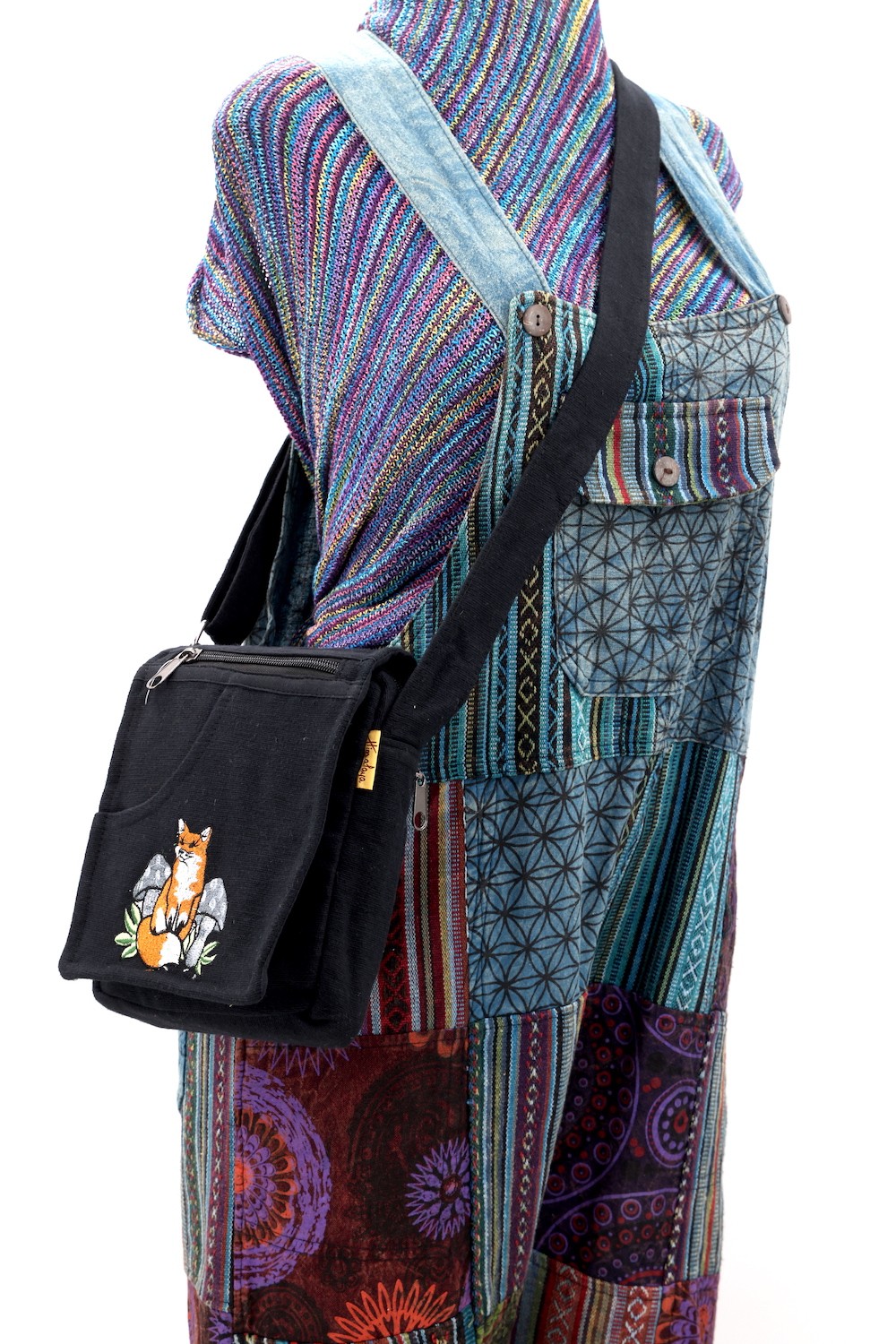 The beautiful Hand-Woven Cotton Travel bag is hand made in Nepal with pure 100% organic Himalaya Cotton. This modern Mushroom Embroidery Cotton passport bag is supremely versatile and fashionable. This bag features are it has two compartments with zippers and it has adjustable strap with outside two pockets in the front and in the main pocket above with a zipper. It is a fair trade made product.