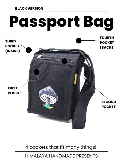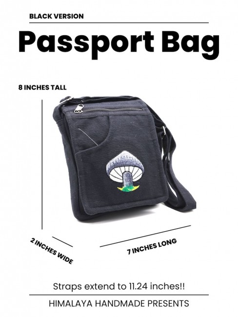 This beautiful Mushroom embroidered 100% pure cotton passport bags are handmade in Nepal. This beautiful passport bag features are it has one pocket in the front & one pocket in the back, it has two compartments, a large main compartment with zippered pocket inside and it has a long adjustable strap 11”-24” inch which you can clutch the bag across your body. This cotton passport bag is extraordinary and fashionable. This passport bag is suitable for carrying document, Mini Tablet, Mobile Phone and Purses.