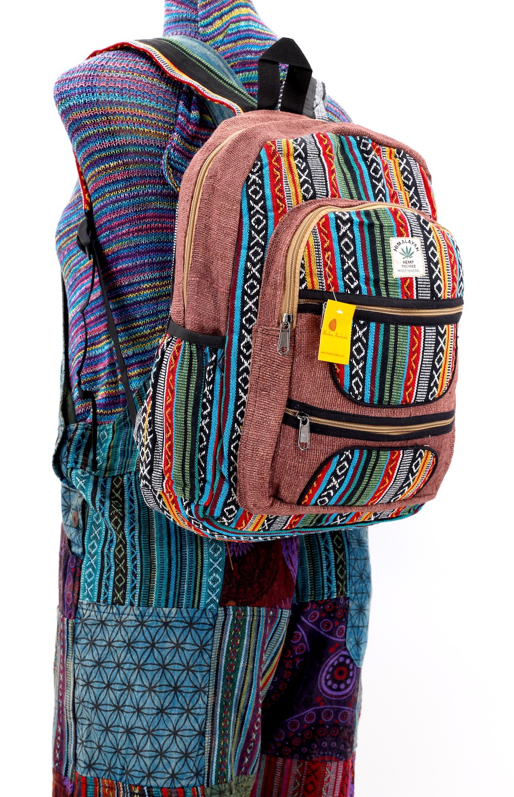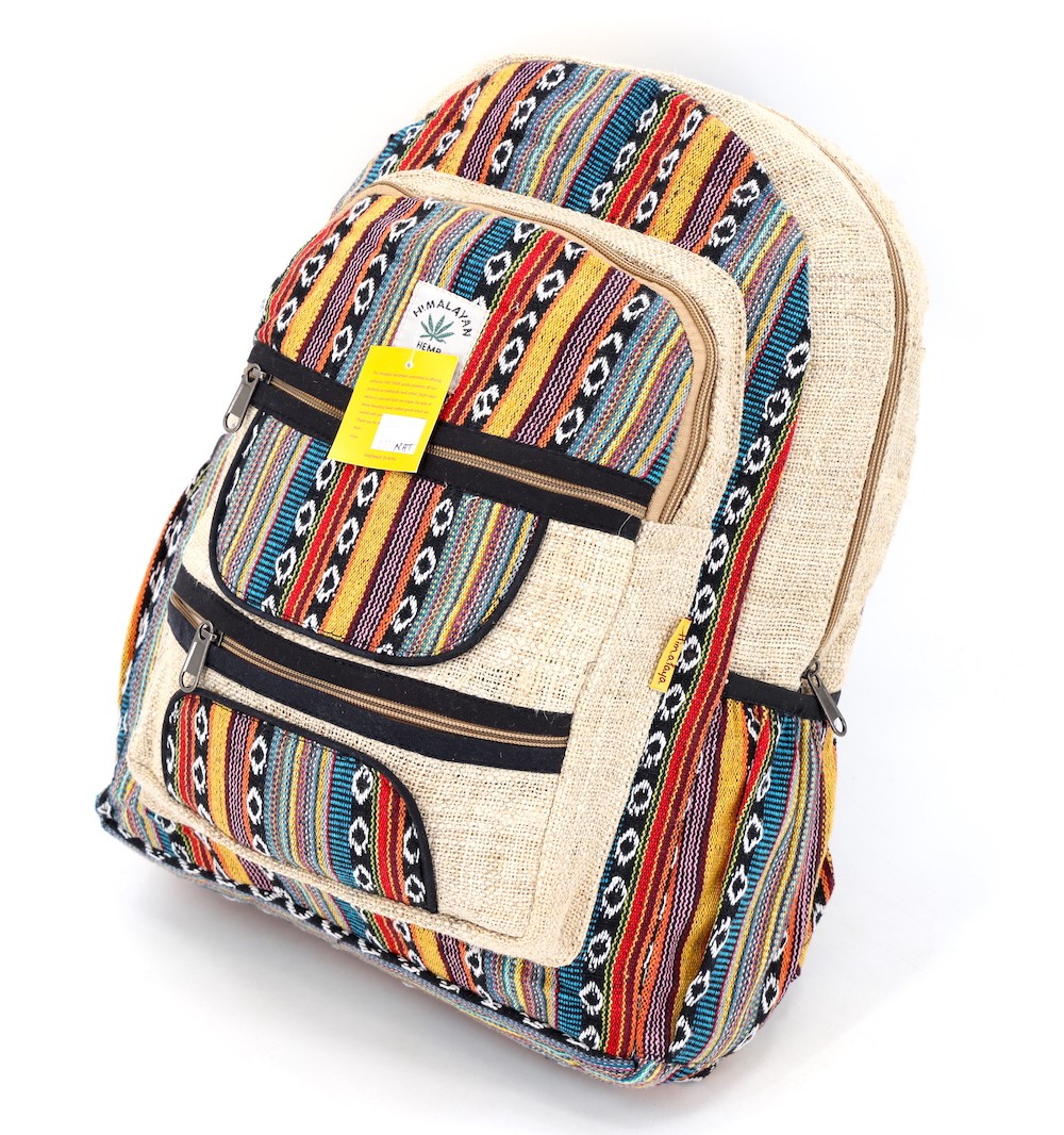 At Himalaya Handmade we are known for creating the modern hemp backpacks that are now available in profusion of design and colors. Our Mini backpack with multicolor Aztec pattern is made from eco-friendly natural hand-woven hemp and cotton fabric and it is beautifully handcrafted in Nepal, they are high quality and this backpack has everything you need. You will not find higher quality anywhere else. All of our bags are sourced from the mountainous regions of Nepal and are all 100% Handmade. This backpack features are it has a unique multi colored pocket. Handcrafted this Backpack Includes, laptop compartment – fits any type and size, 4 separate zippered compartments with 2 pockets, 2 water bottle holders, extremely strong construction, strong original two metal zippers on main compartment, soft padded straps and made from 100% Hemp, the entire bag is extremely strong but also breathable. Color of these bag will not be exact because arrangement of the pattern and these bags are handmade so in color can be slightly different. Pictures color are just example. Every bag is handmade and therefore unique.