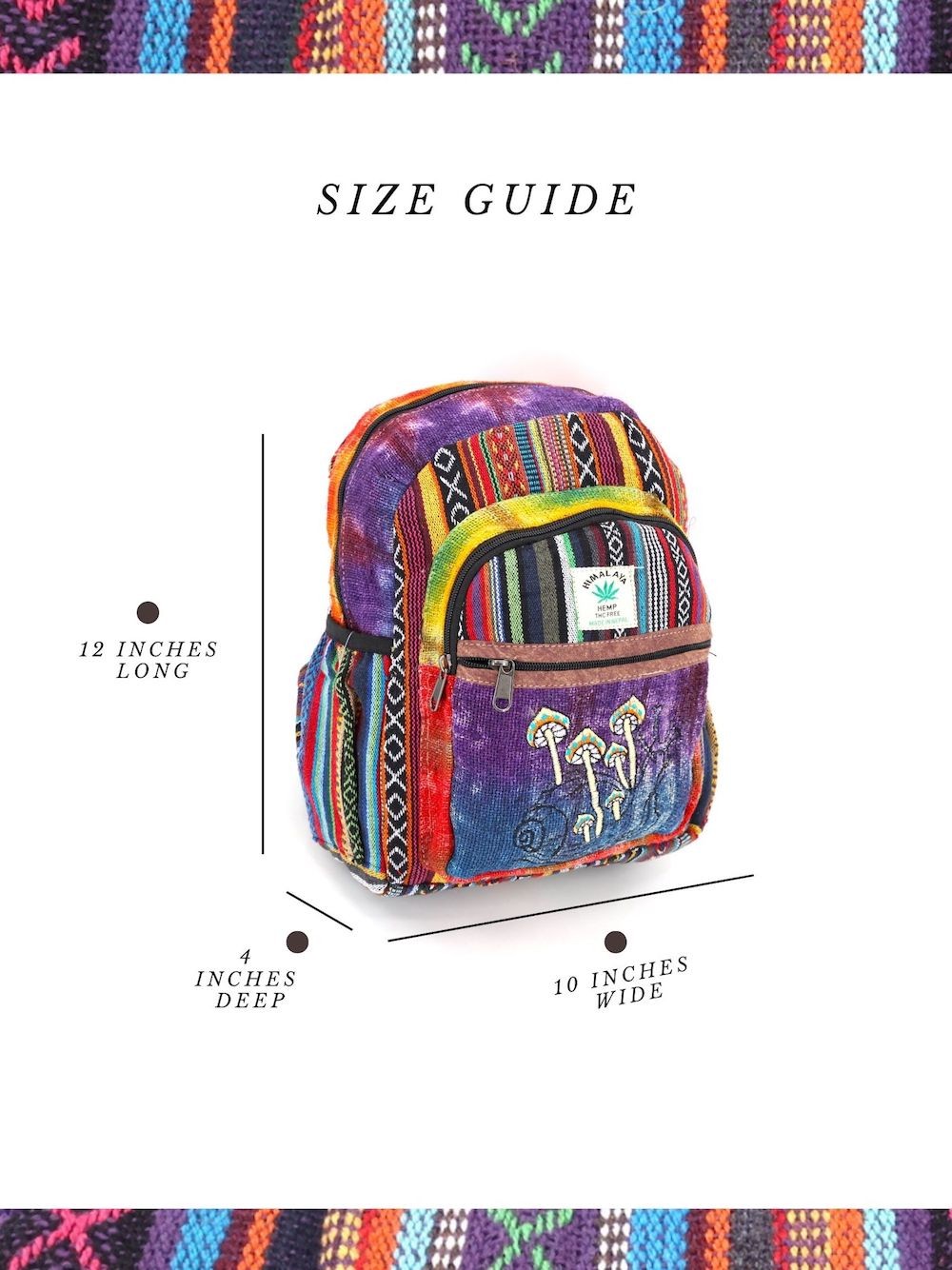 - At Himalaya Handmade we are known for creating the modern Mini hemp backpacks that are now available in a vast array of design and colors. Our Mini backpack with multicolor Aztec pattern which is made from eco-friendly natural hand-woven hemp and cotton fabric which is beautifully handcrafted in Nepal, they are of high quality and our backpacks have everything that you will need. You will not find products of higher quality anywhere else. All of our bags are sourced from the mountainous regions of Nepal and are all 100% Handmade. This backpack features are it has a unique multi colored pocket. Handcrafted this uniquely versatile Backpack comes with 2 pockets on the front both zippered and secured with a Velcro, the larger front pocket also has a zippered anti-theft pocket as well as compartment that can be used to store objects as large as 12 inches, There is also a secret back pocket which is zippered and can be used to contains various items, the bag also comes equipped with 2 water bottle holders. The bag has extremely strong construction, it has strong original two metal zippers on main compartment, soft padded straps and made from 100% Hemp, the entire bag is extremely strong but also breathable. Color of these bag will not be exact because arrangement of the pattern and the nature of these bags being handmade can cause the colors and patterns to be slightly different. Images for this bag are an overall example to what the bag looks like. Every bag is handmade and therefore unique.