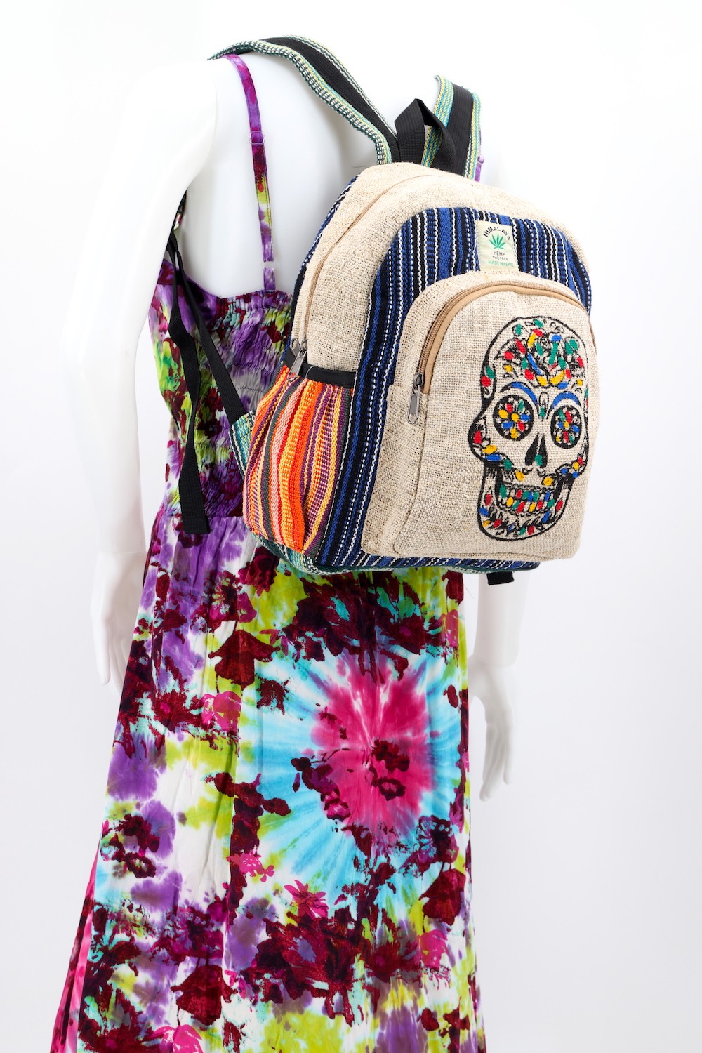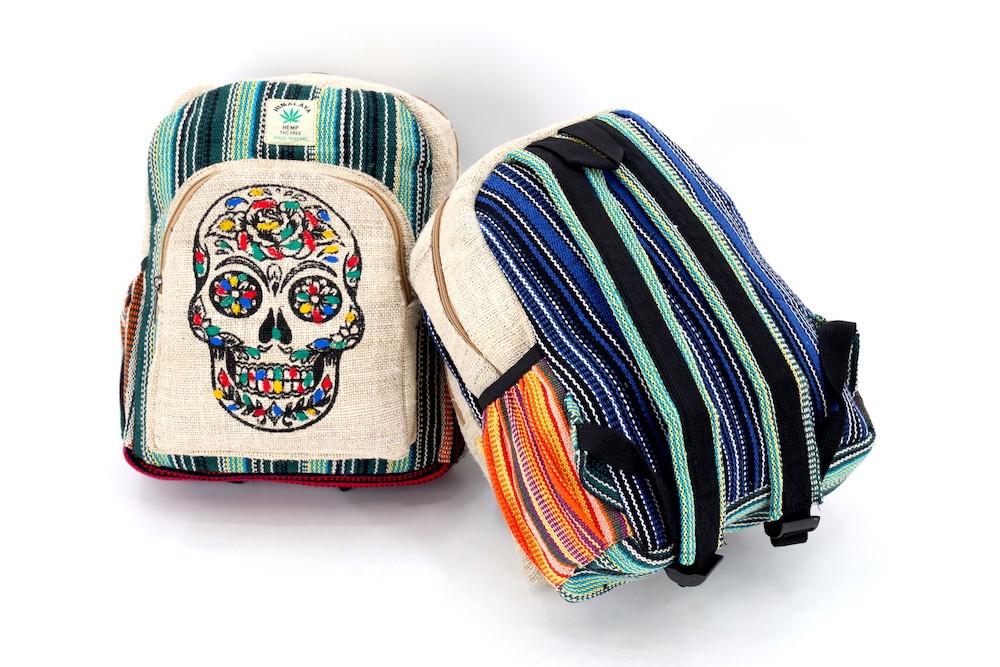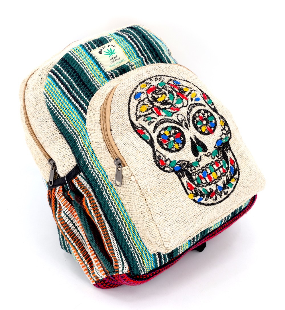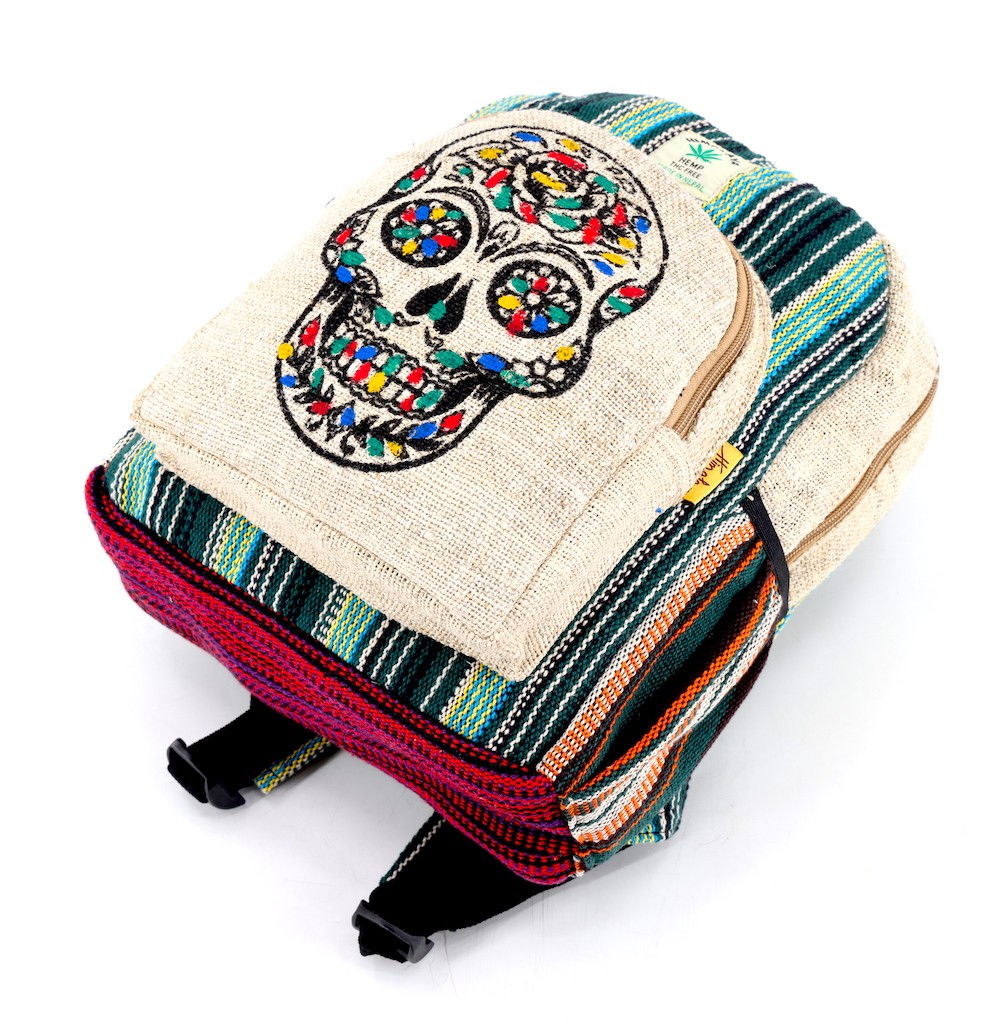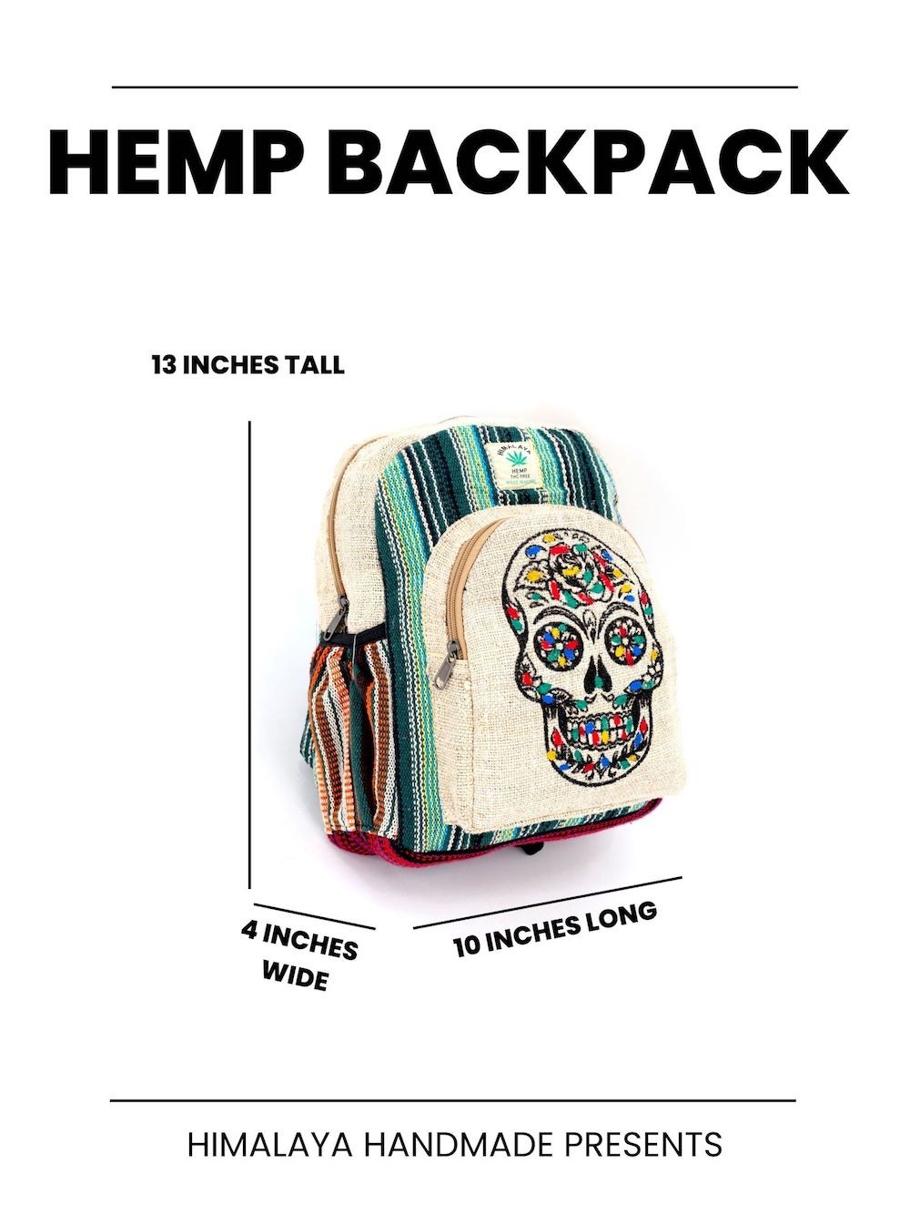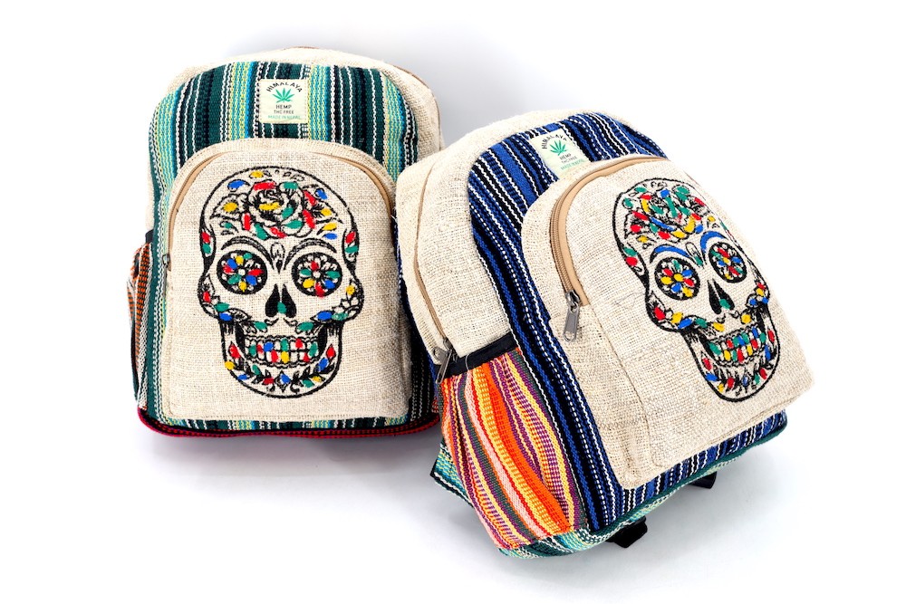 A versatile and beautiful Skull Hand Embroidered Hemp Backpack made by 100% Natural THC Free Himalaya Hemp Fabric stitched by talented artisans in Himalaya Range of Nepal. Support underprivileged Nepalese communities with your purchase.