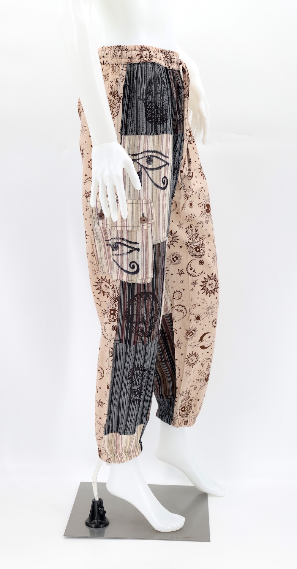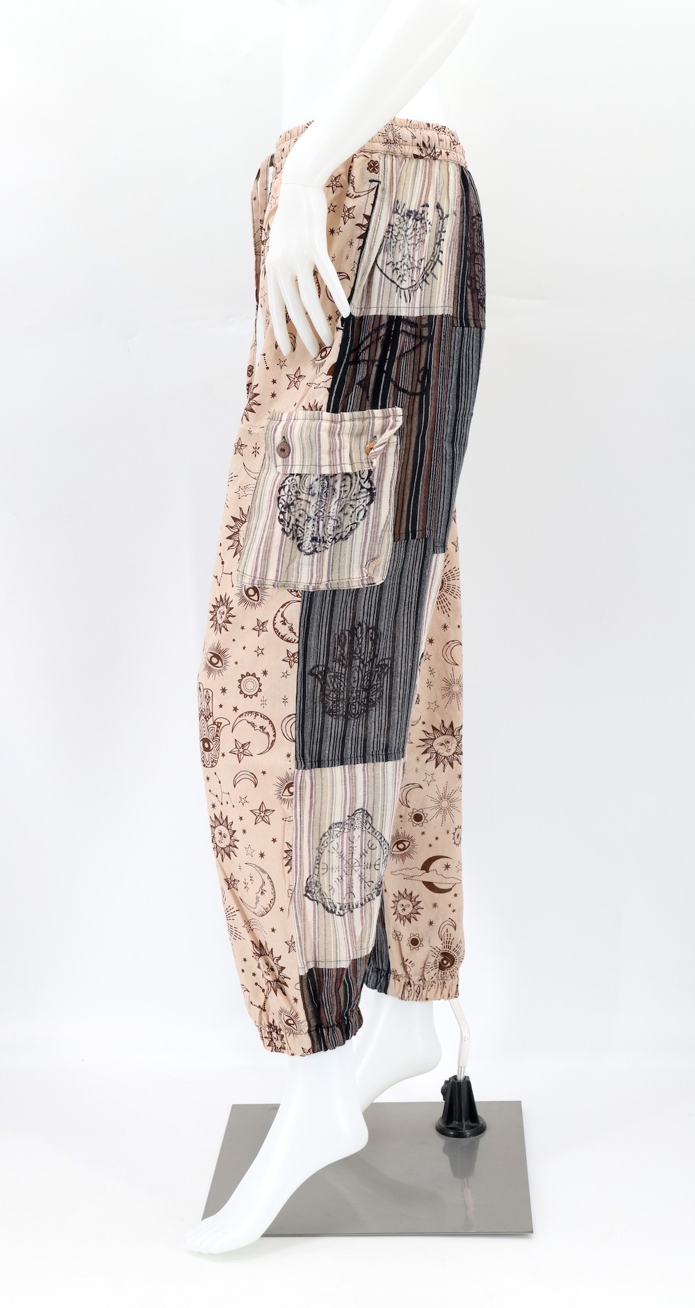 Every clothing item is meticulously handmade, reflecting the care and consideration put into their creation, resulting in unmatched quality. Because our products are handmade, the patchwork colors and patterns on each pair of trousers may vary, making each one unique. The provided image serves as a general representation of the product's appearance.