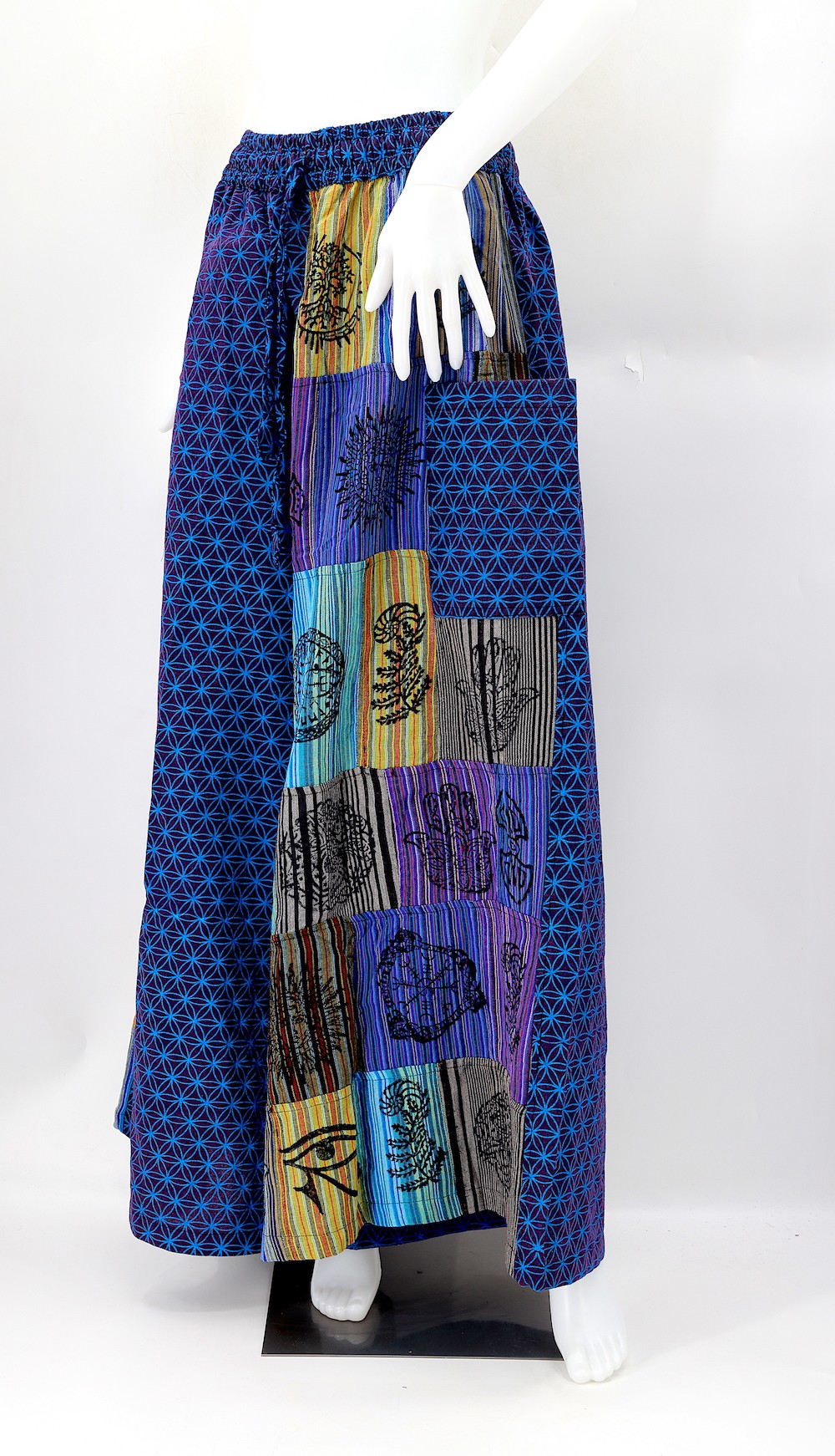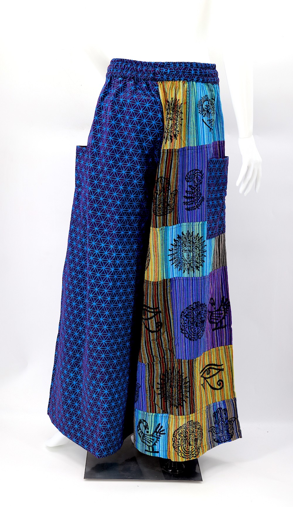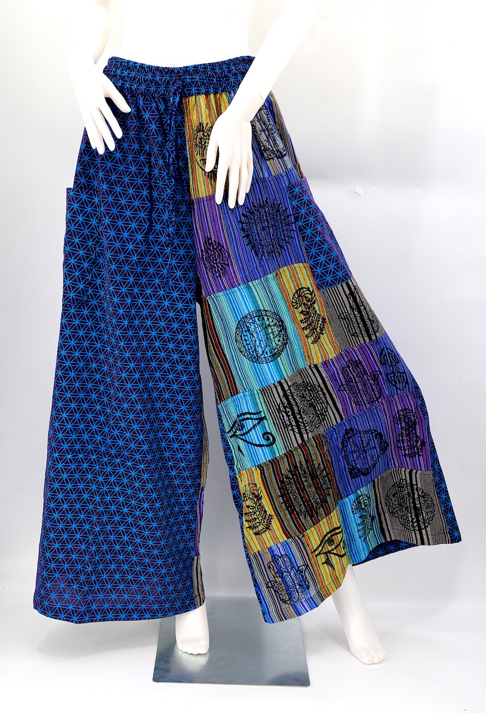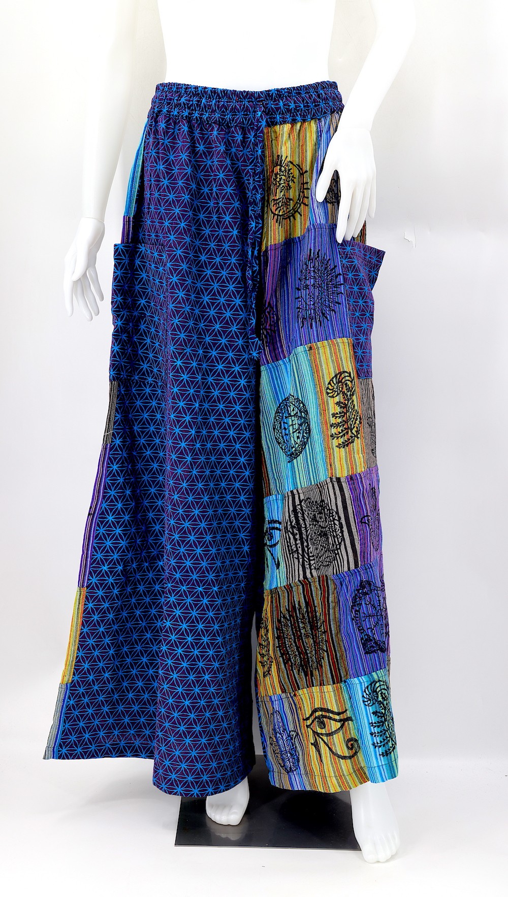 These unique Hippie Flower of Life Designed Pagan Symbols Block Print Patchwork Pants are crafted from the finest 100% Natural Handwoven Cotton by some of the most skilled artisans. Elevate your style instantly with these extraordinary and highly fashionable Wide Leg Patchwork Pants that are suitable for almost any occasion, ensuring you look your best every time.