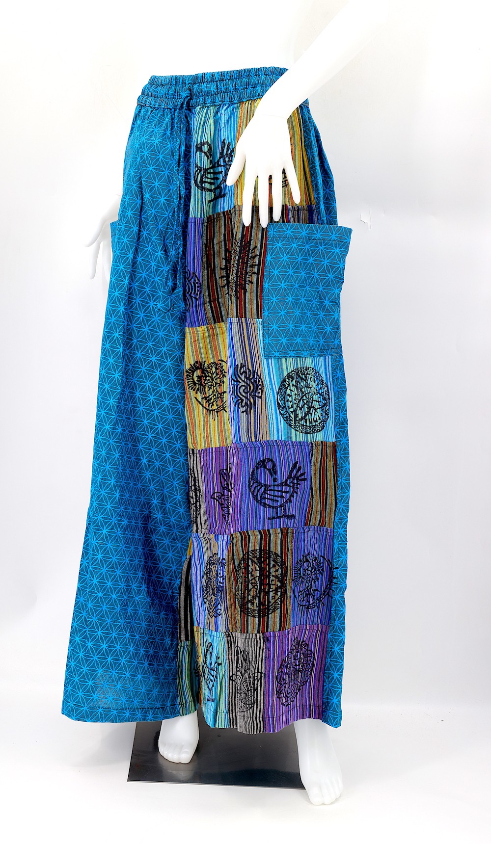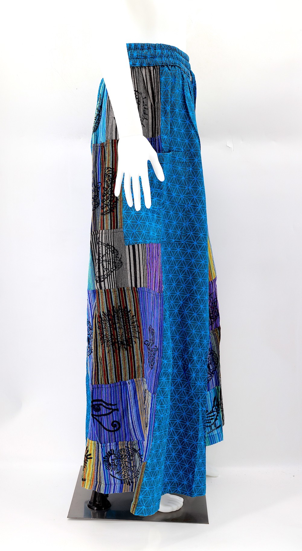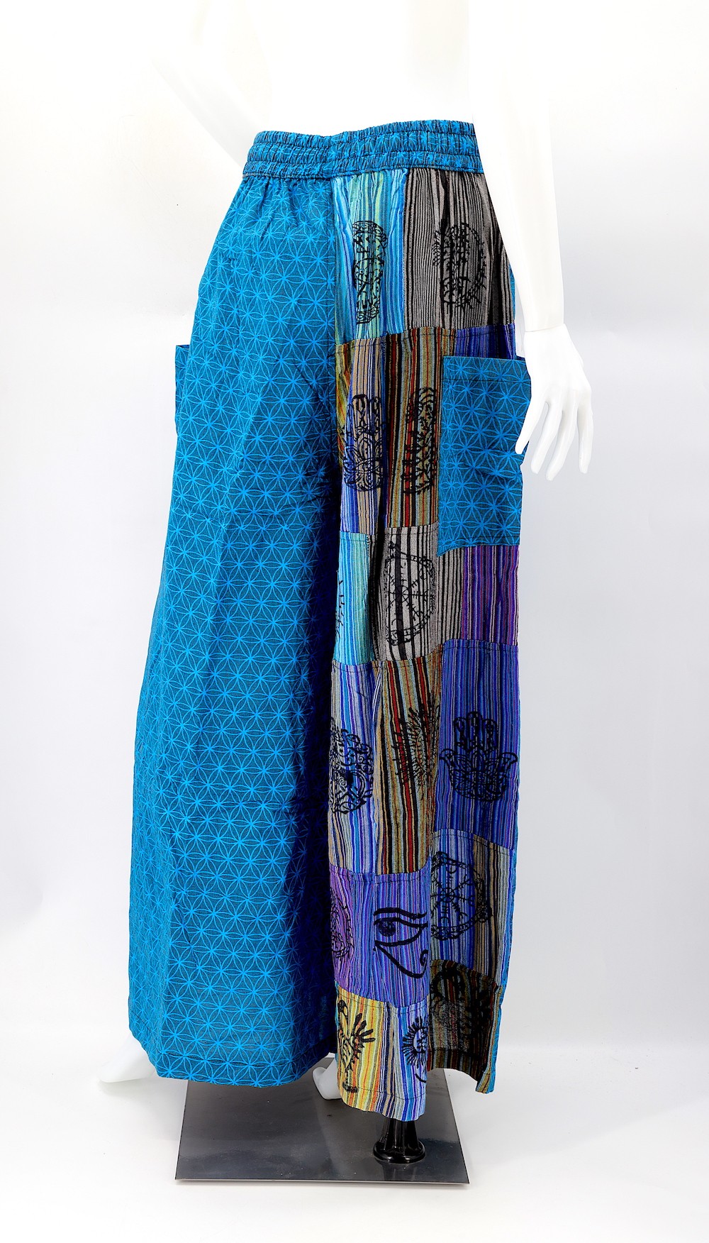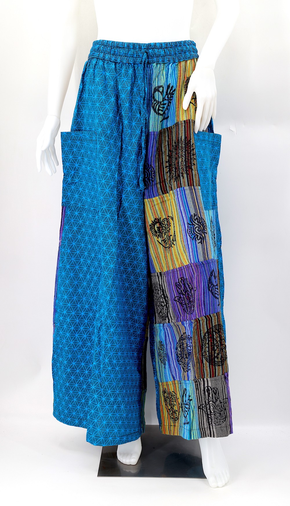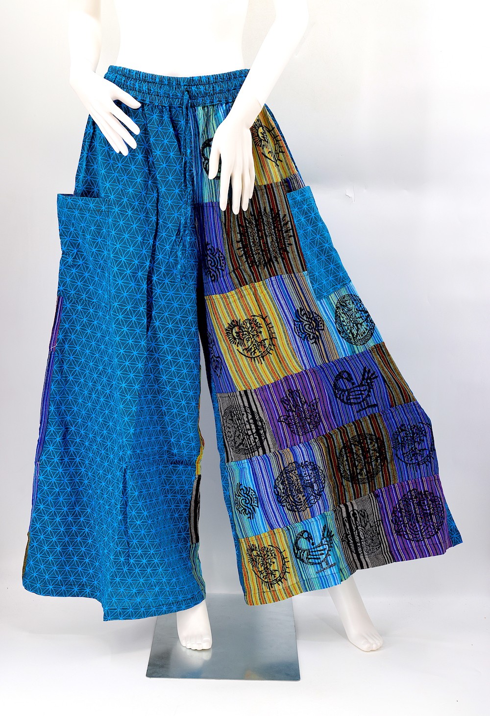 These unique Hippie Flower of Life Designed Pagan Symbols Block Print Patchwork Pants are crafted from the finest 100% Natural Handwoven Cotton by some of the most skilled artisans. Elevate your style instantly with these extraordinary and highly fashionable Wide Leg Patchwork Pants that are suitable for almost any occasion, ensuring you look your best every time.