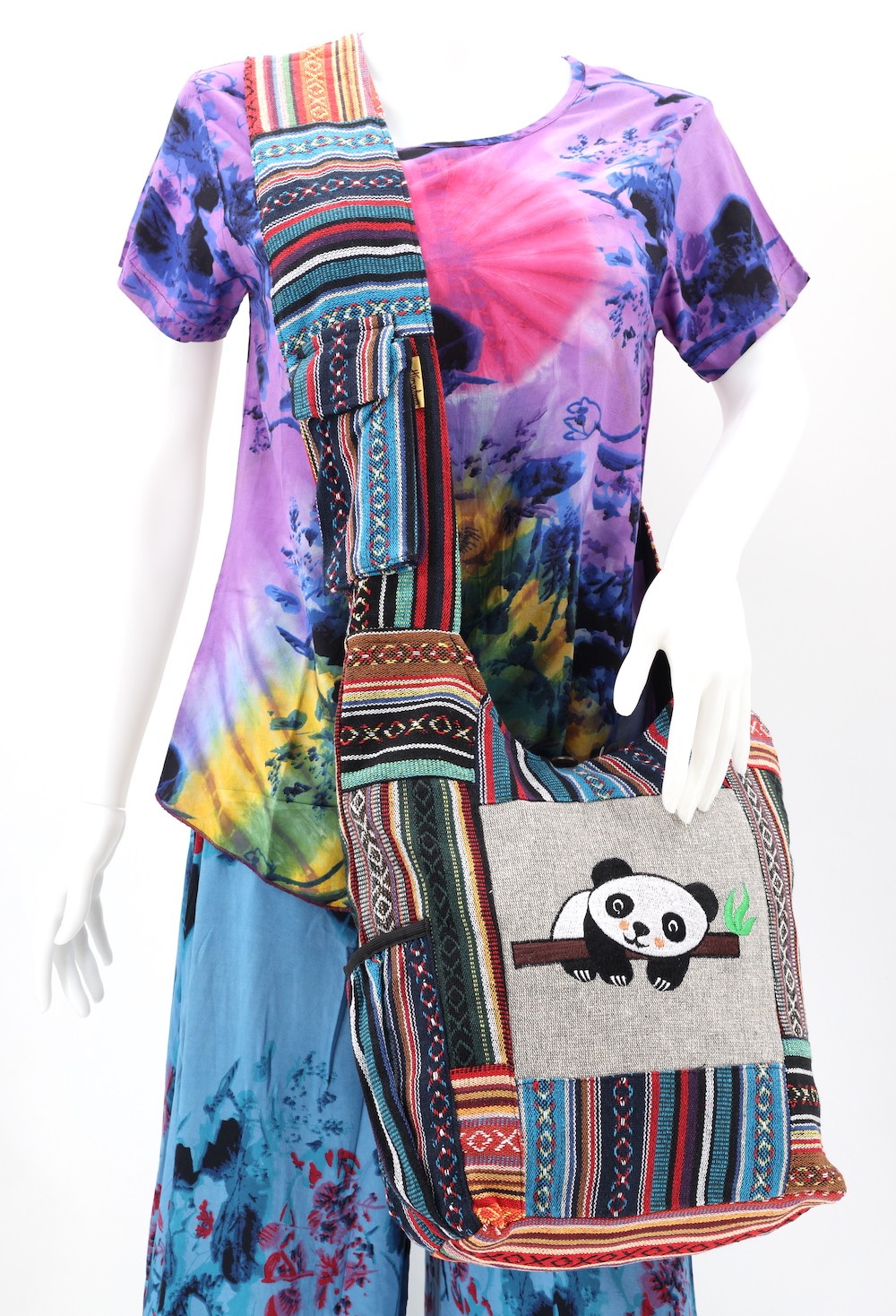 A versatile and beautiful Panda embroidery colorful 100% Natural Handwoven Cotton Fabric stitched by talented artisans in Himalaya range of Nepal. Purchasing means supporting underprivileged Nepalese communities who help make these bags.