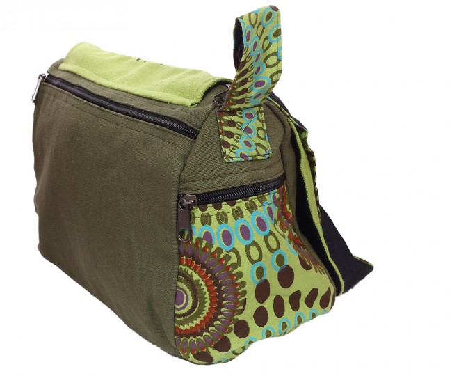 This beautiful Om printed ladies cotton bags are handmade in Nepal. This beautiful ladies bags features are it has one outside pocket, 2 small pocket in the side & a large main compartment with zippered, it has also secrete pocket inside the main compartment and it is specially design for ladies. This cotton bag is extraordinary and fashionable. It is fair trade product.