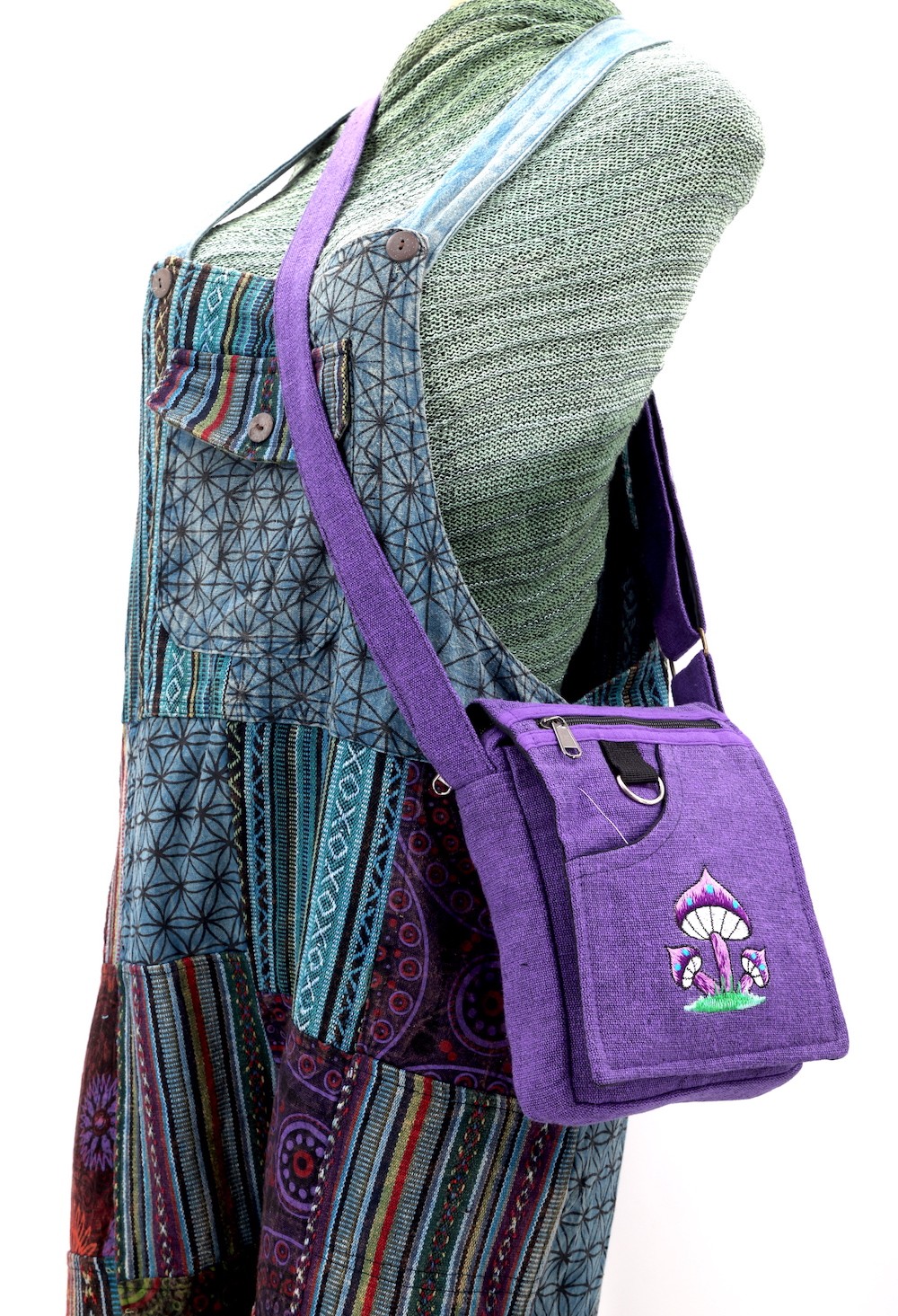 The beautiful Hand-Woven Cotton Travel bag is hand made in Nepal with pure 100% organic Himalaya Cotton. This modern Mushroom Embroidery Cotton passport bag is supremely versatile and fashionable. This bag features are it has two compartments with zippers and it has adjustable strap with outside two pockets in the front and in the main pocket above with a zipper. It is a fair trade made product.