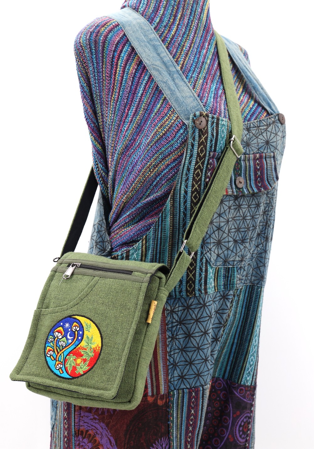 The beautiful Hand-Woven Cotton Travel bag is hand made in Nepal with pure 100% organic Himalaya Cotton. This modern Mushroom Embroidery Cotton passport bag is supremely versatile and fashionable. This bag features are it has two compartments with zippers and it has adjustable strap with outside two pockets in the front and in the main pocket above with a zipper. It is a fair trade made product.