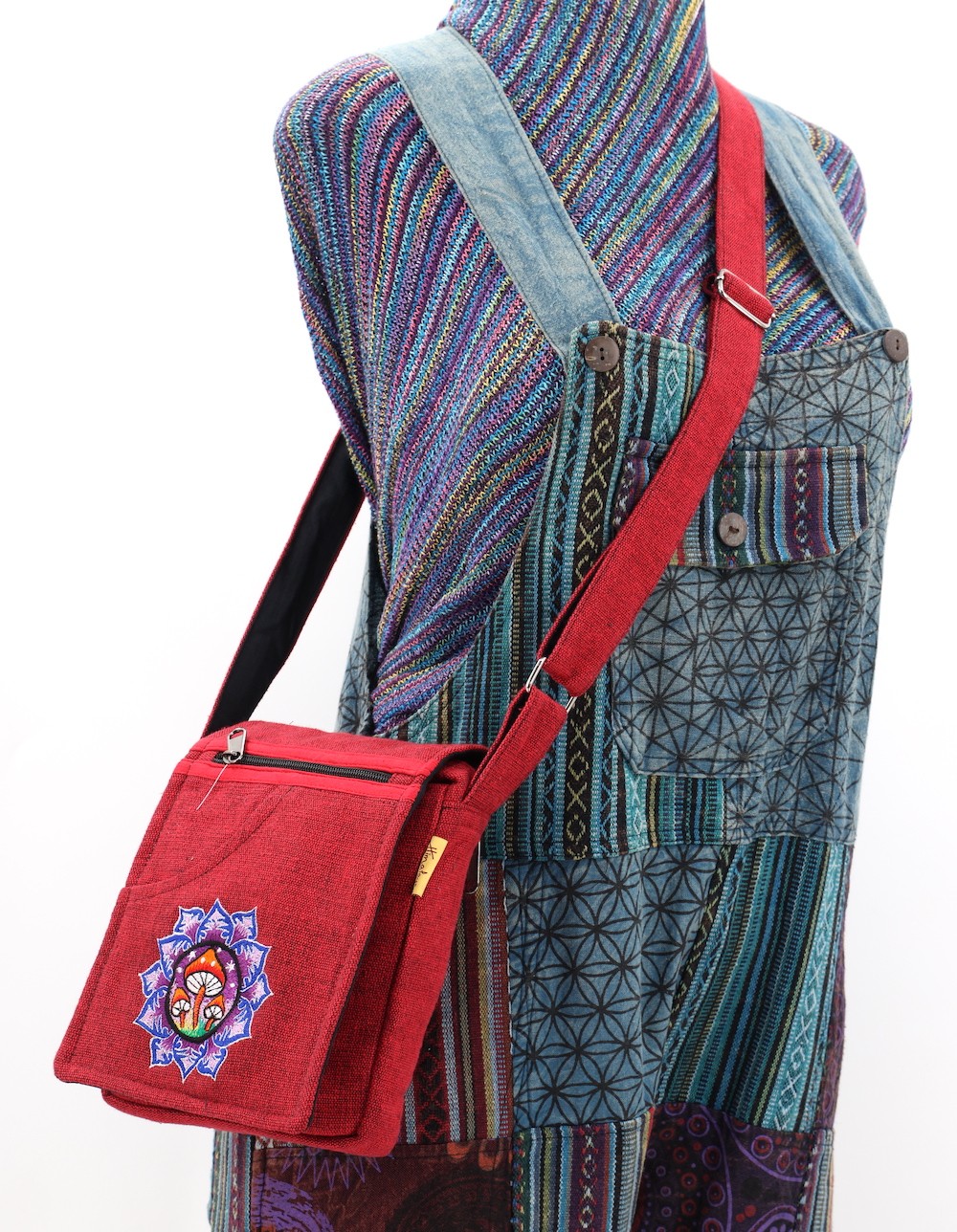 The beautiful Hand-Woven Cotton Travel bag is hand made in Nepal with pure 100% organic Himalaya Cotton. This modern Mushroom Embroidery Cotton passport bag is supremely versatile and fashionable. This bag features are it has two compartments with zippers and it has adjustable strap with outside two pockets in the front and in the main pocket above with a zipper. It is a fair trade made product.