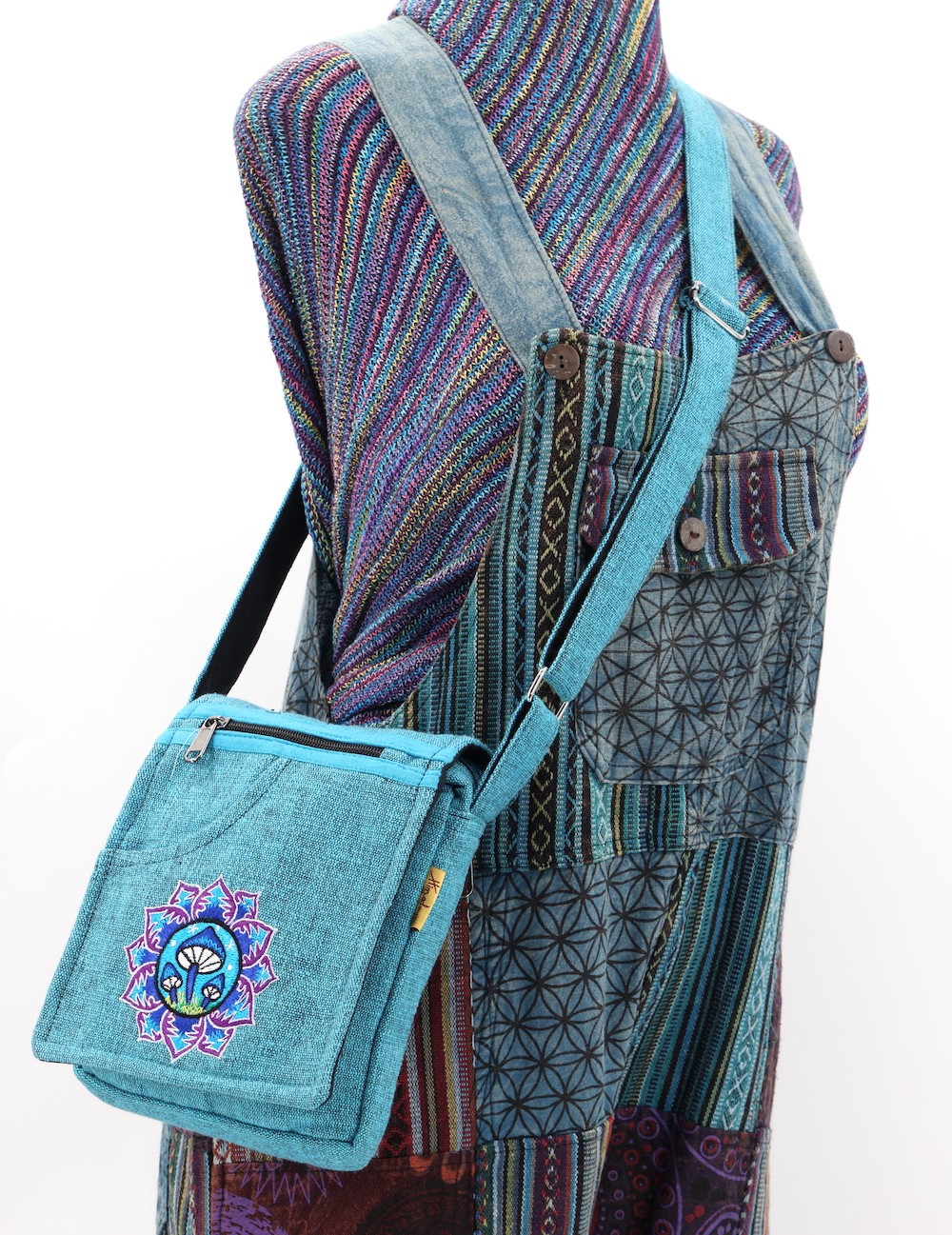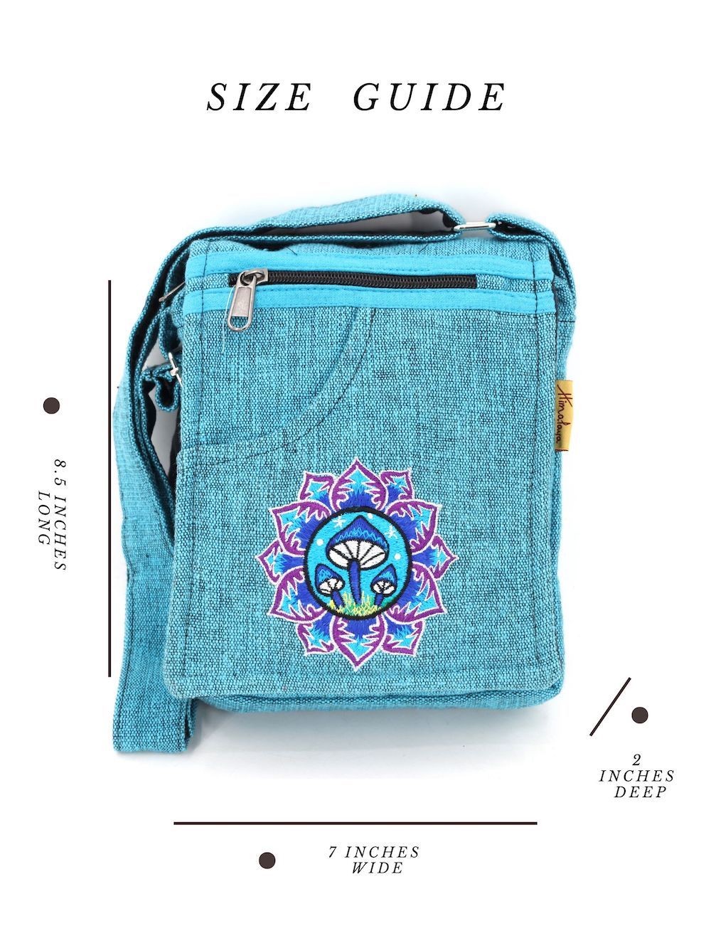 The beautiful Hand-Woven Cotton Travel bag is hand made in Nepal with pure 100% organic Himalaya Cotton. This modern Mushroom Embroidery Cotton passport bag is supremely versatile and fashionable. This bag features are it has two compartments with zippers and it has adjustable strap with outside two pockets in the front and in the main pocket above with a zipper. It is a fair trade made product.