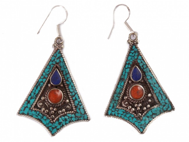 The authentic and beautiful handmade German silver earring mixed with turquoise polished stone and garnet polished stone. These earrings are both whimsical and fashionable also these earrings are authentic reflection of the ancient cultures of Nepal. From simple, classic styles to unique cocktail earrings and these styles of earring fit for any occasion. These earrings are crafted by using only simple hand tools and perfected silver pieces inset with quality gemstones. These earring unique and exotic design makes you the highlight of any crowd.