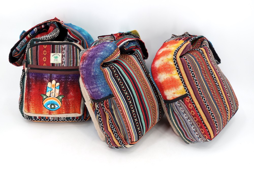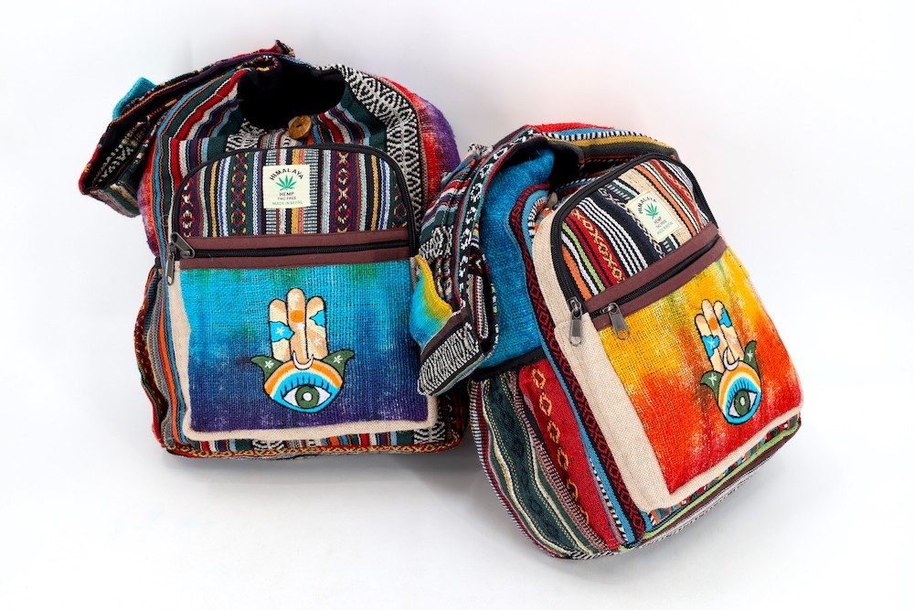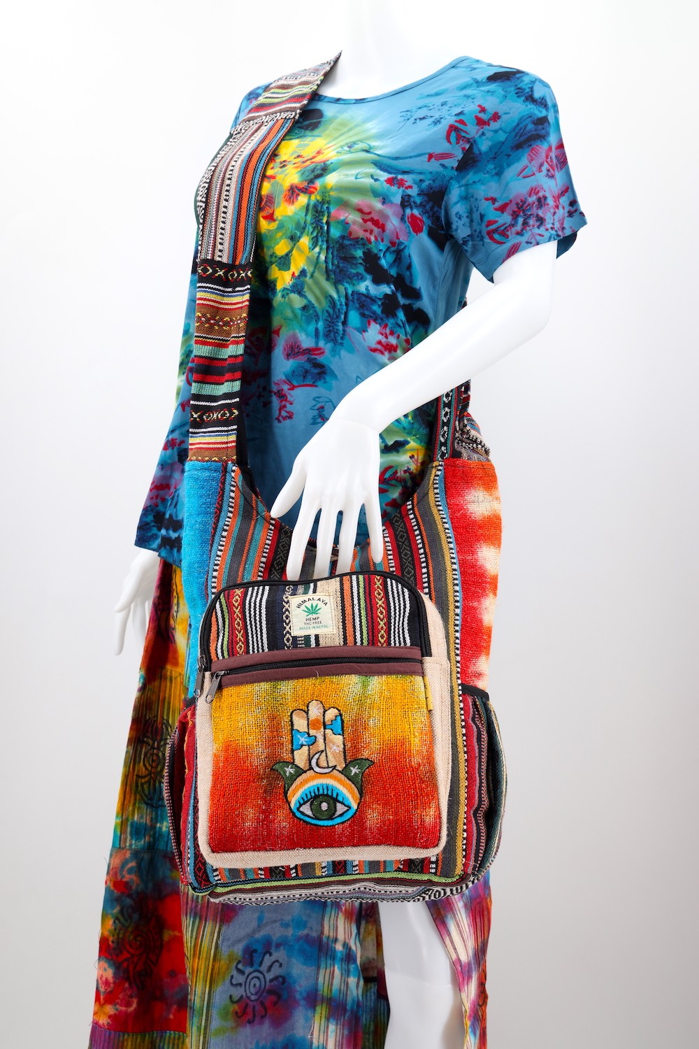 A versatile and beautiful humsa embroidery colorful 100% Natural Handwoven Hemp stitched by talented artisans in Himalaya range of Nepal. Purchasing means supporting underprivileged Nepalese communities who help make these bags.