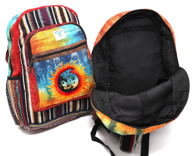Unique Design Sun Moon Hand Embroidery with double Stitched highest quality Himalaya Hemp and double zipper with fully adjustable shoulder straps one size fits all.