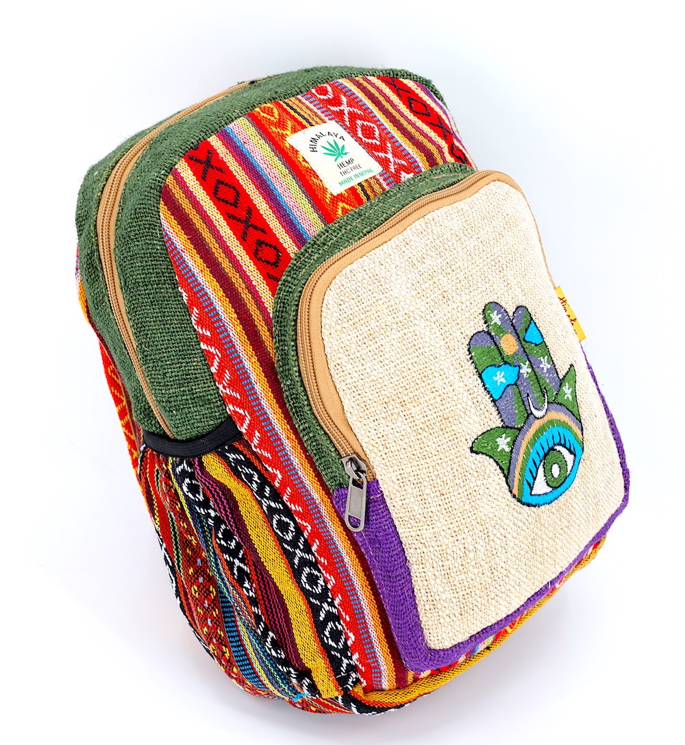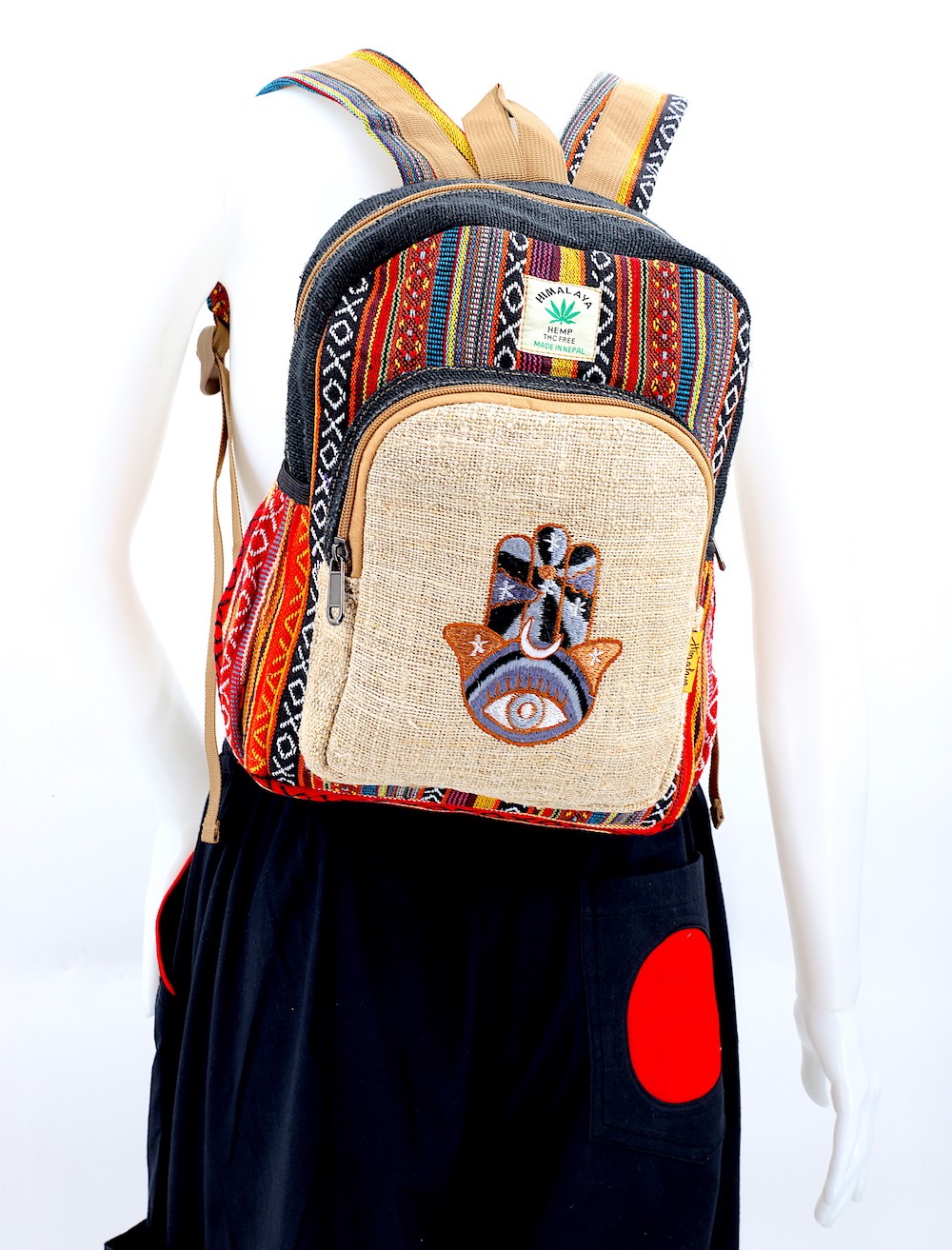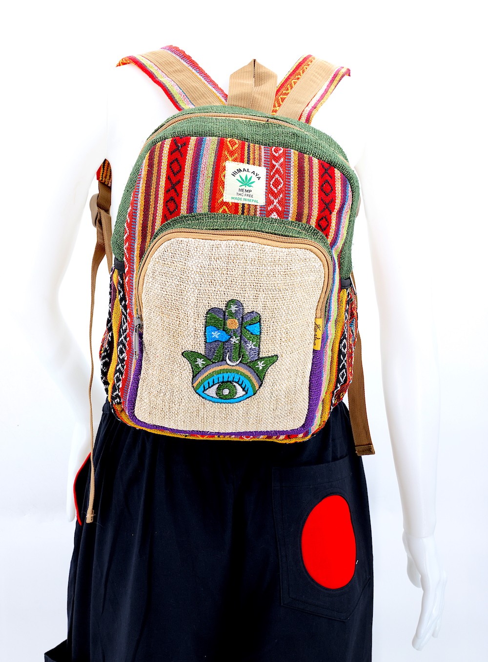 A versatile and beautiful Hamsa Hand, Hand Embroidered Hemp Backpack made with 100 percent natural THC-free Himalaya hemp. Stitched and assembled by the most talented artisans in Nepal.