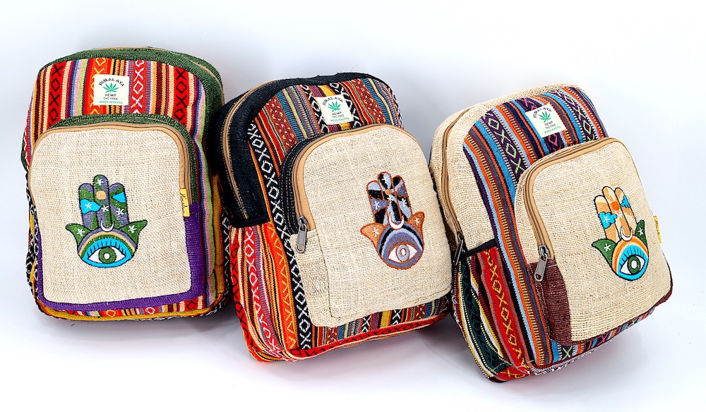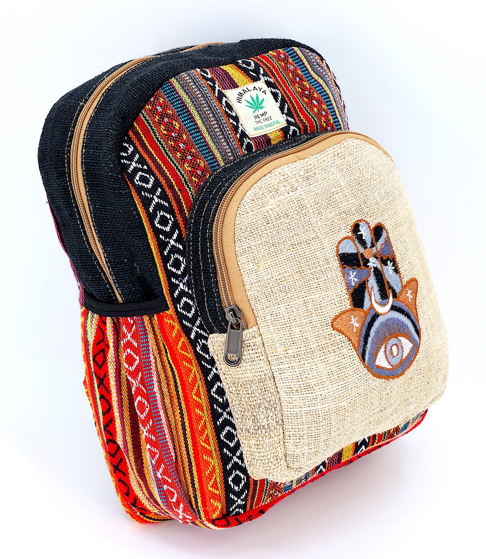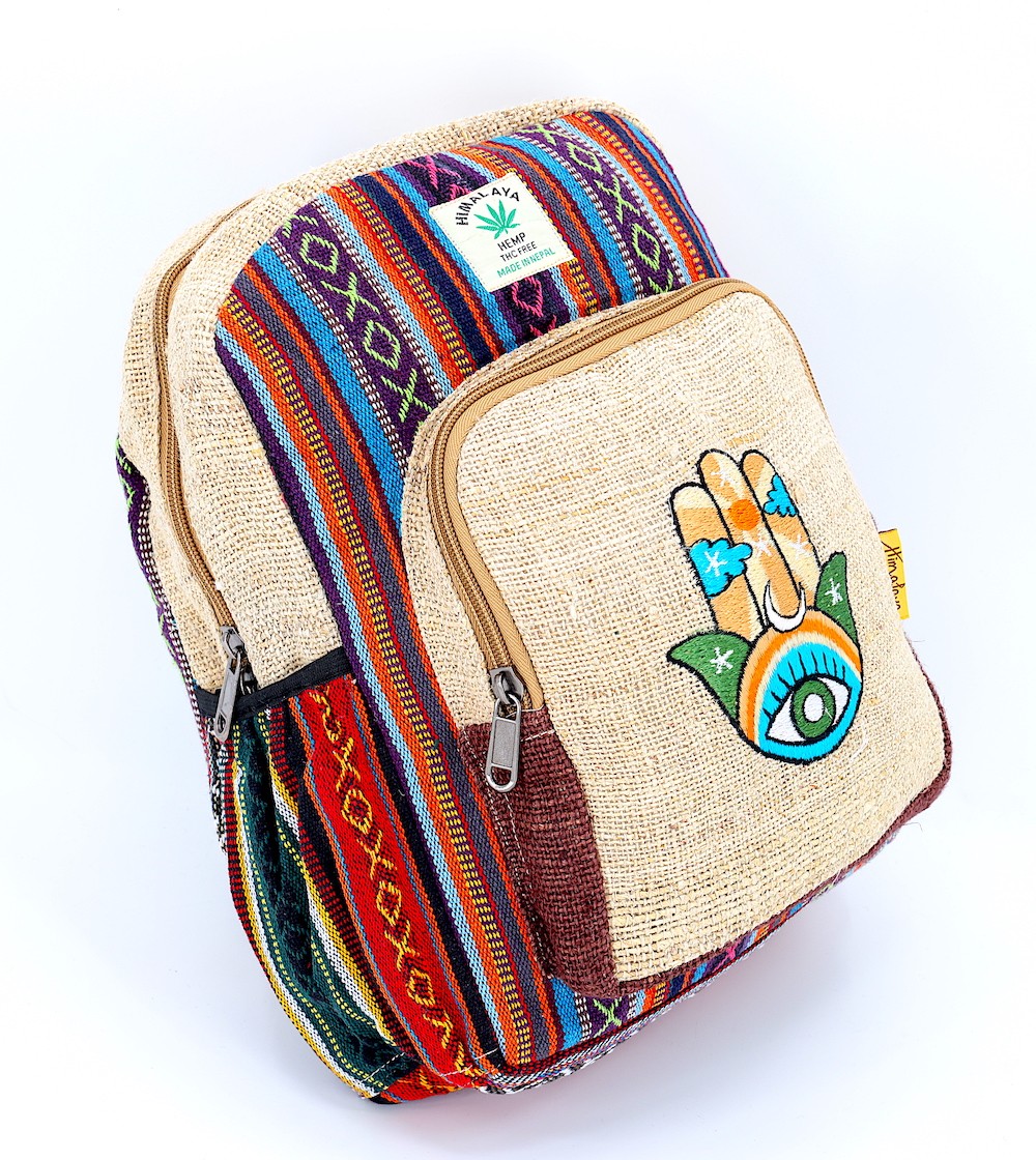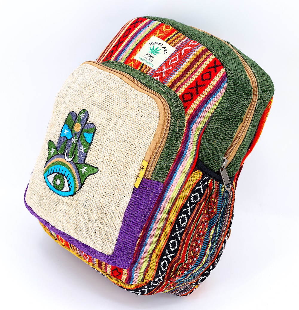 A versatile and beautiful Hamsa Hand, Hand Embroidered Hemp Backpack made with 100 percent natural THC-free Himalaya hemp. Stitched and assembled by the most talented artisans in Nepal.