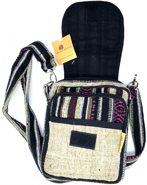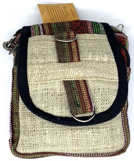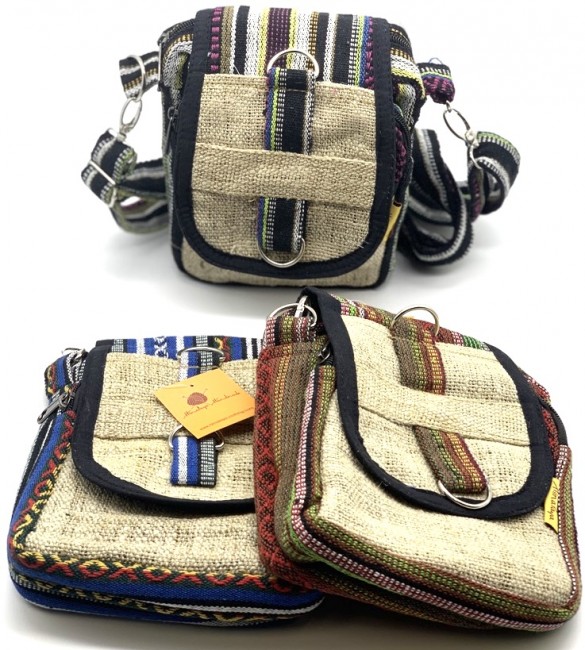 The beautiful hemp Travel bag is hand made in Nepal with pure 100% organic core hemp. This modern hemp passport bag is supremely versatile and fashionable. This bag features are it has two compartments with zippers and it has adjustable strap with outside two pockets in the front and in the main pocket above with a zipper. It is fair trade product.