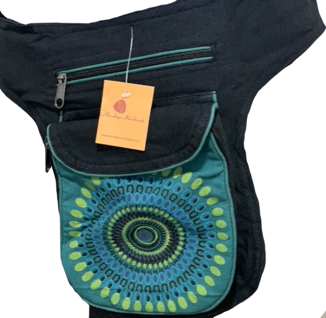 100% pure cotton colorful money belt handmade in Nepal. This product can be use by both man and women. This bag has charming features, it has beautiful Mandala print, it is practical and versatile because it can be belt bag/fanny pack /shoulder bag, it has 3 pocket with zippers, main pocket has magnetic button, 1 pocket is hidden on the back side, small pocket on the outside also has magnetic button, the belt is adjustable which can make shorter and longer as well. It is fair trade product.