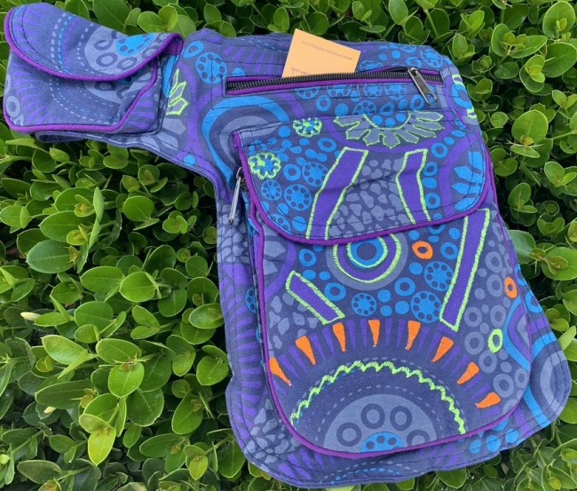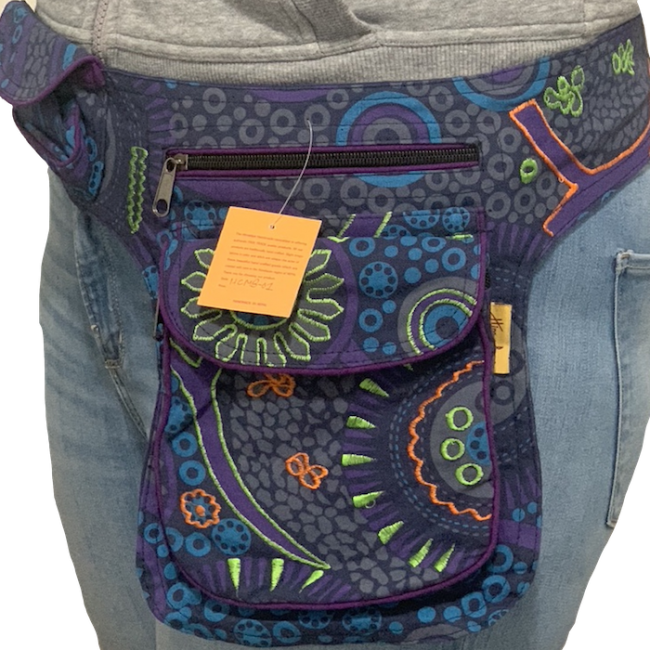100% pure cotton colorful money belt handmade in Nepal. This product can be use by both man and women. This bag has charming features, it has beautiful print and flower embroideries,it is practical and versatile because it can be belt bag/fanny pack /shoulder bag, it has 3 pocket with zippers, main pocket has magnetic button, 1 pocket is hidden on the back side, small pocket on the outside also has magnetic button, the belt is adjustable which can make shorter and longer as well. It is fair trade product.