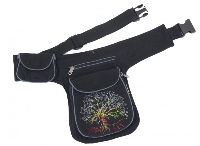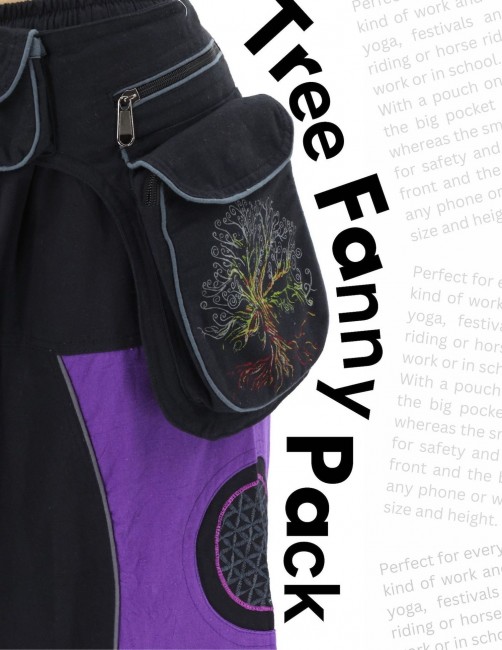 100% pure cotton Tree of Life designed Fanny Pack is handmade in Nepal. This product can be used by women or men and is usually worn lower on the hips. This bag has charming features, it has a beautiful print of the Tree of life, it is practical and versatile because it can be used as a belt bag, fanny pack as well as a shoulder bag, it has 3 pockets in the front with zippers and additionally all three pockets come equipped with a zipper, A pocket is hidden on the back side, the belt is adjustable from 29 - 40 inches which can be made shorter and longer to tend to your needs, and the belt also includes a small compartment which is big enough to fit coins and money. This is a Fair-Trade product.