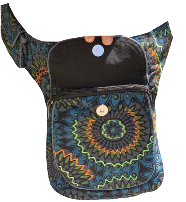 100% pure cotton colorful money belt handmade in Nepal. This product can be use by both man and women. This bag has charming features, it has beautiful print and flower embroideries,it is practical and versatile because it can be belt bag/fanny pack /shoulder bag, it has 3 pocket with zippers, main pocket has magnetic button, 1 pocket is hidden on the back side, small pocket on the outside also has magnetic button, the belt is adjustable which can make shorter and longer as well. It is fair trade product.