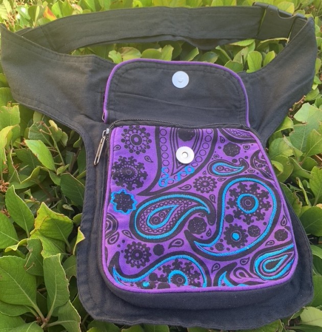 100% pure cotton colorful money belt handmade in Nepal. This product can be use by both man and women. This bag has charming features, it has beautiful print and flower embroideries,it is practical and versatile because it can be belt bag/fanny pack /shoulder bag, it has 3 pocket with zippers, main pocket has magnetic button, 1 pocket is hidden on the back side, small pocket on the outside also has magnetic button, the belt is adjustable which can make shorter and longer as well. It is fair trade product.