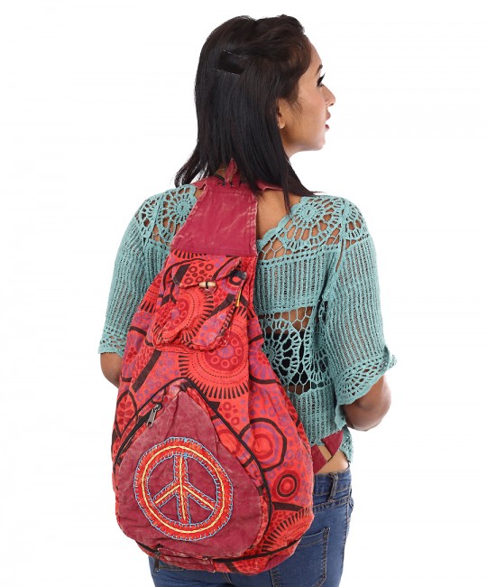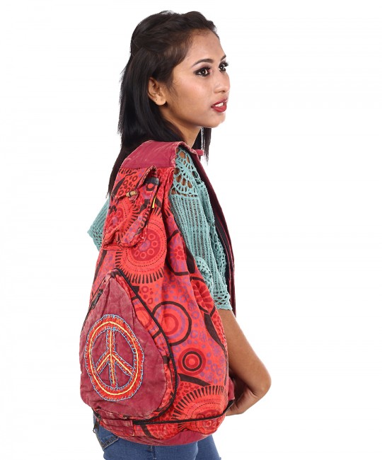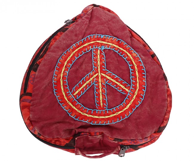This beautiful Mandala printed with symbole of peace embroidered, 100% pure cotton back pack are handmade in Nepal. This beautiful back pack features are it has two compartment with zippers, it has secrete pocket with zipper in side the main compartment, two pocket on the side, the main compartment has cover and it has a long adjustable soft strap and this back pack pack is unique, extraordinary,versatile and fashionable. It can be folded in heart shape as well. This cotton back pack is fair trade product.