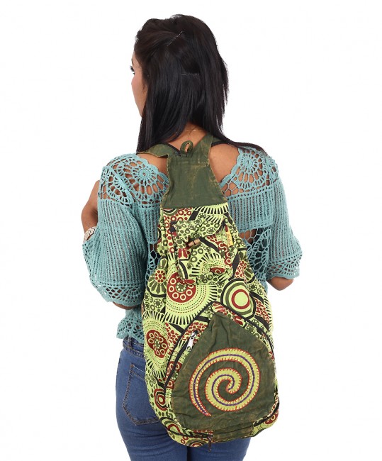 This beautiful Mandala printed with spiral embroidered 100% pure cotton back pack are handmade in Nepal. This beautiful back pack features are it has two compartment with zippers, it has secrete pocket with zipper in side the main compartment, two pocket on the side, the main compartment has cover and it has a long adjustable soft strap and this back pack pack is unique, extraordinary,versatile and fashionable. It can be folded in heart shape as well. This cotton back pack is fair trade product.