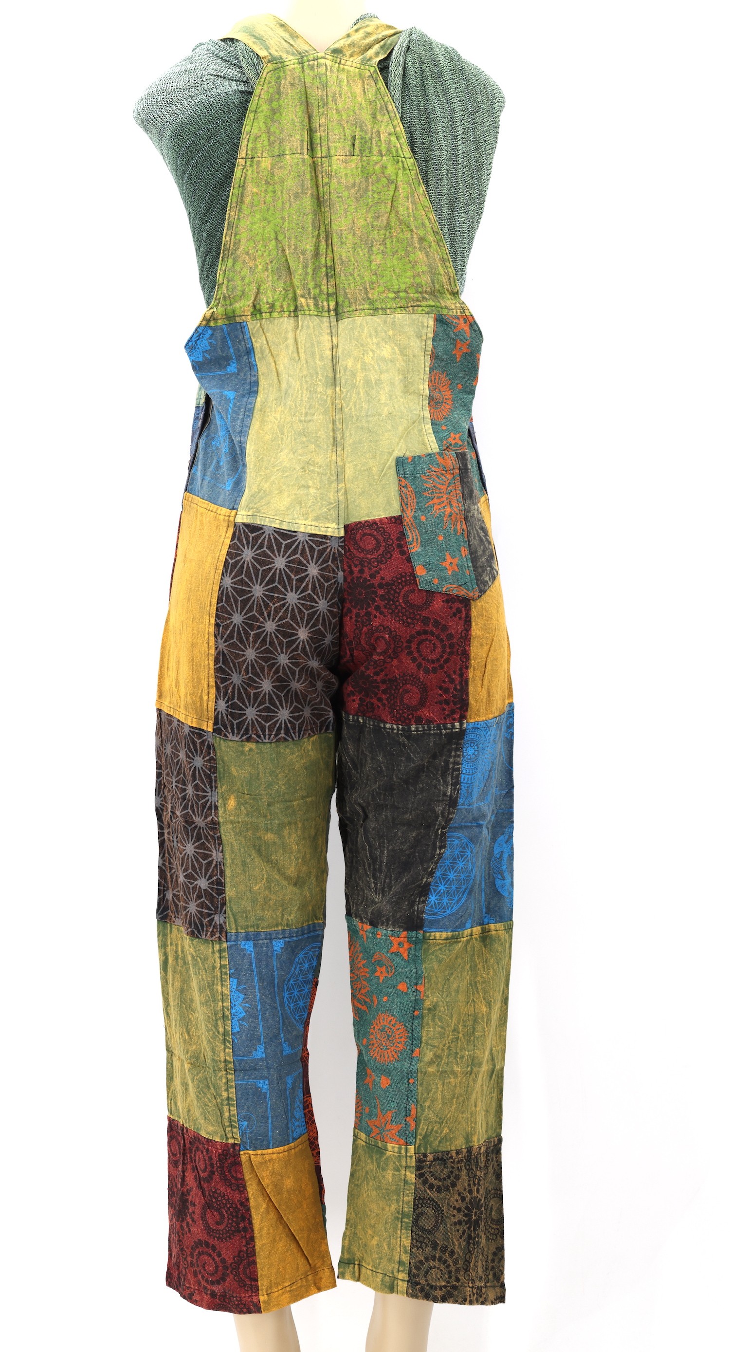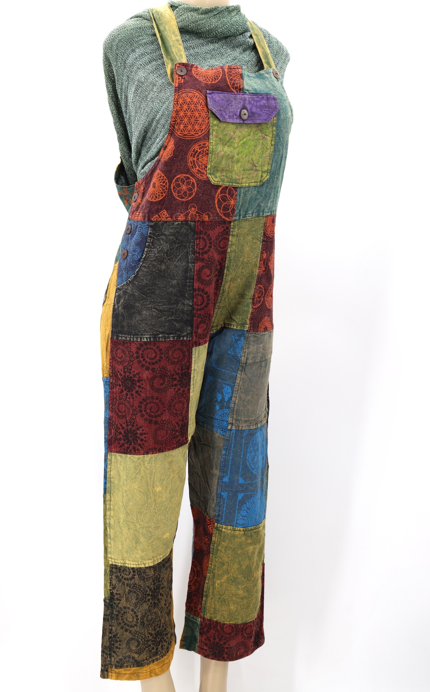 A versatile and beautiful Hand Print Patch Colorful Overall 100% Natural Cotton Fabric stitched by talented artisans in Himalaya range of Nepal. Support underprivileged Nepalese communities with your purchase.