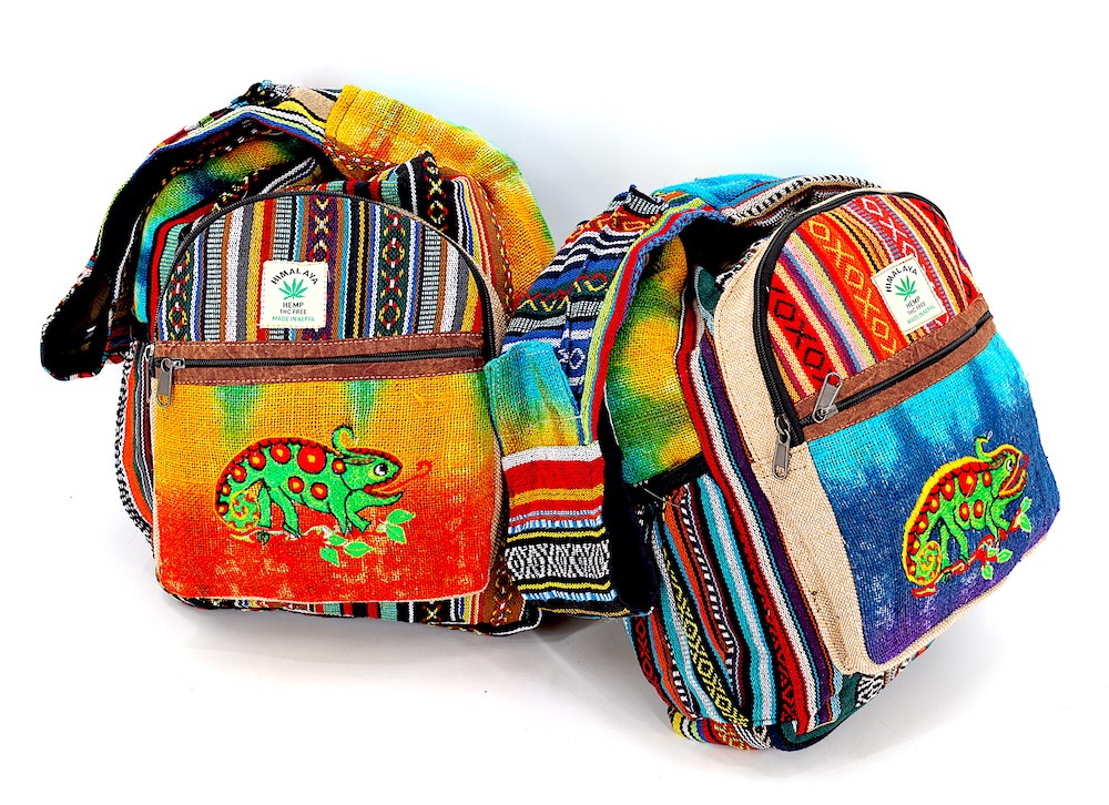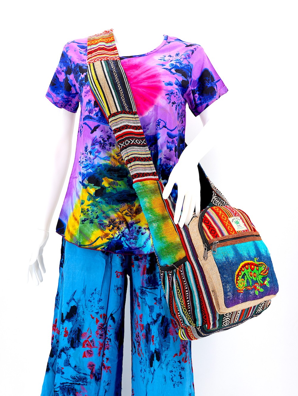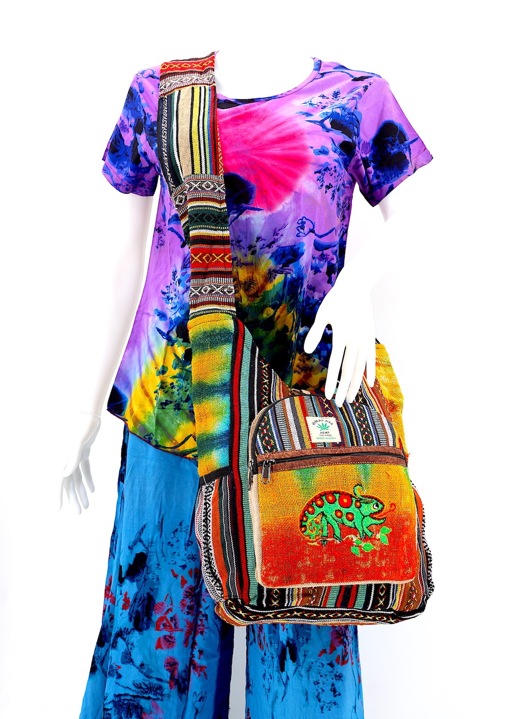 A versatile and beautiful Chameleon embroidered colorful 100% Natural Handwoven Hemp Shoulder Bag stitched by talented artisans in Himalaya range of Nepal. Purchasing means supporting underprivileged Nepalese communities who help make these bags.
