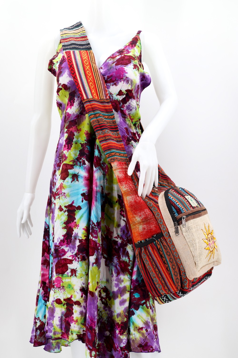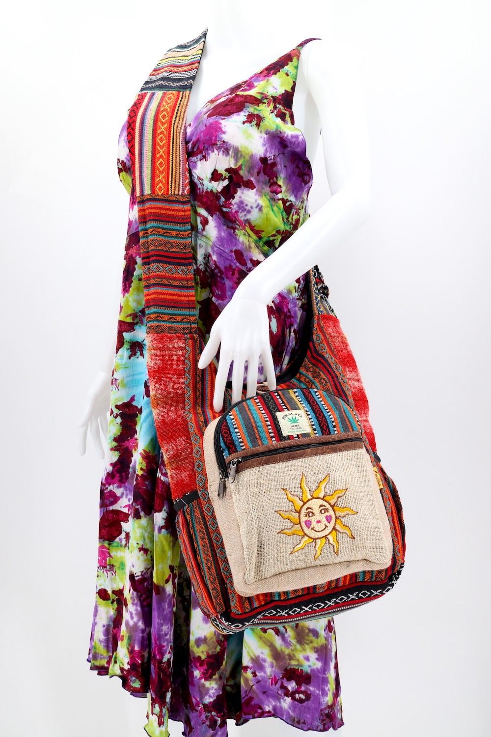 A versatile and beautiful sun embroidery colorful 100% Natural Handwoven Hemp stitched by talented artisans in Himalaya range of Nepal. Purchasing means supporting underprivileged Nepalese communities who help make these bags.